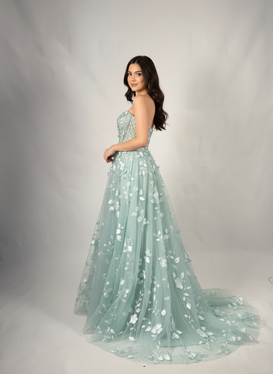 Trägerloses Tüll-Abendkleid mit 3D-Blüten - E304