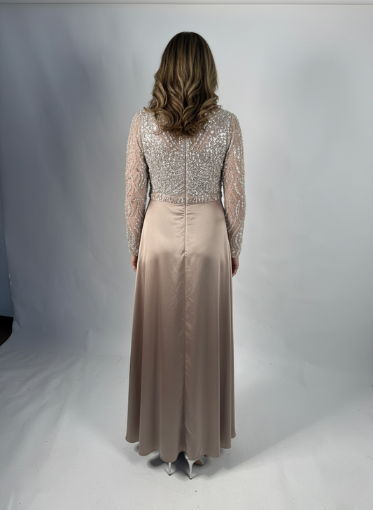 Langes Chiffon-Abendkleid mit Perlenstickerei und langen Ärmeln E347