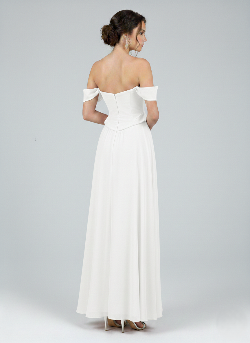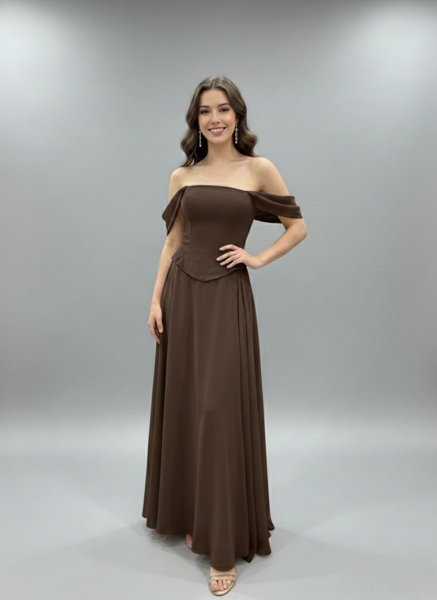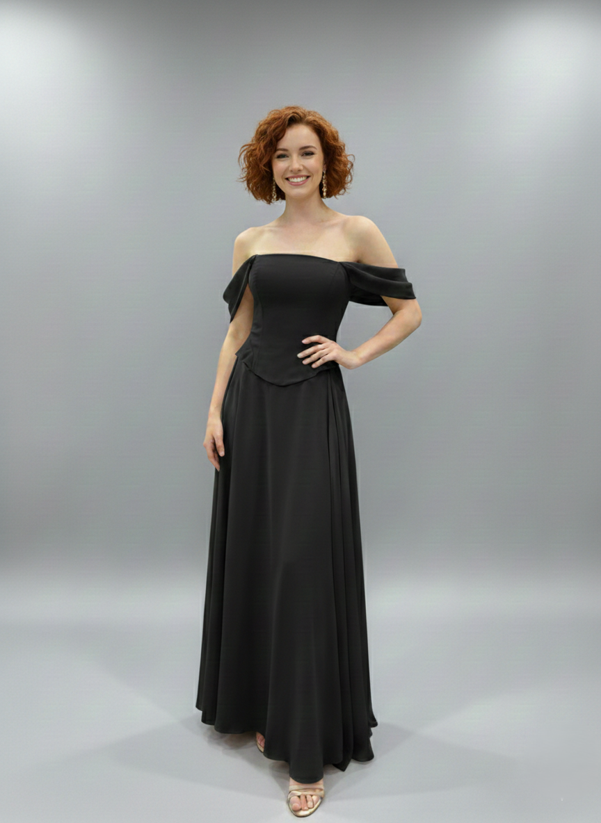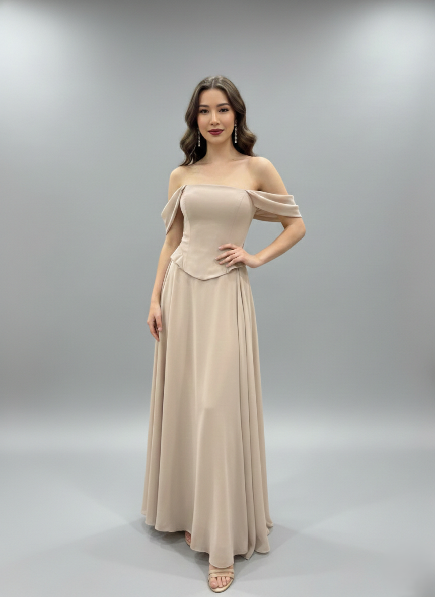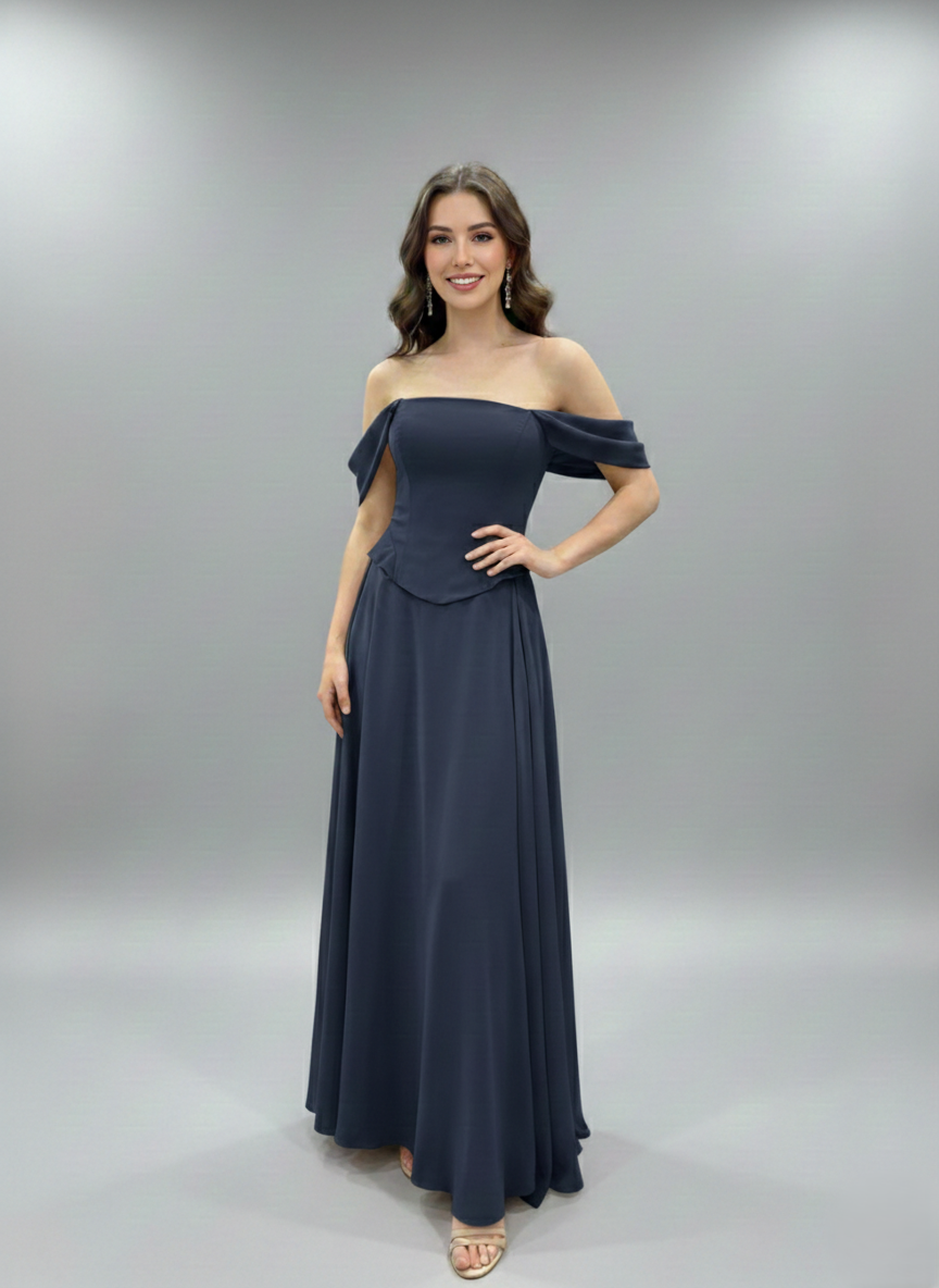 Combining modern design with classic elegance, this gown features a flattering off-shoulder neckline and a tailored bodice. Its flowing skirt creates a graceful silhouette, making it the perfect choice for any special occasion.