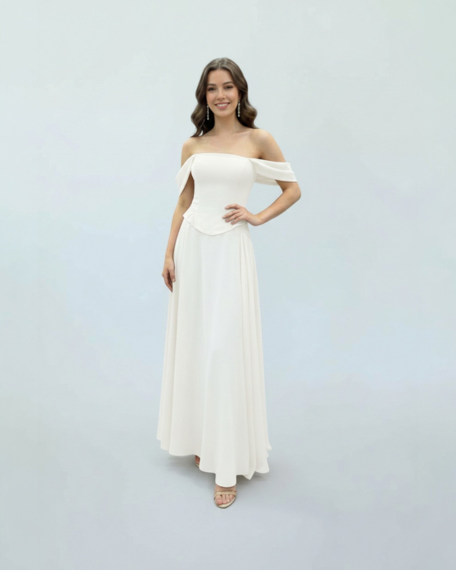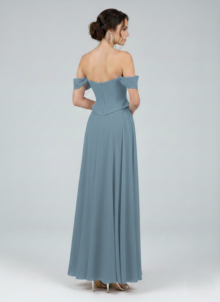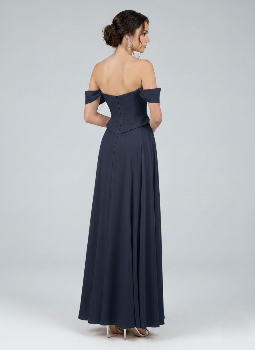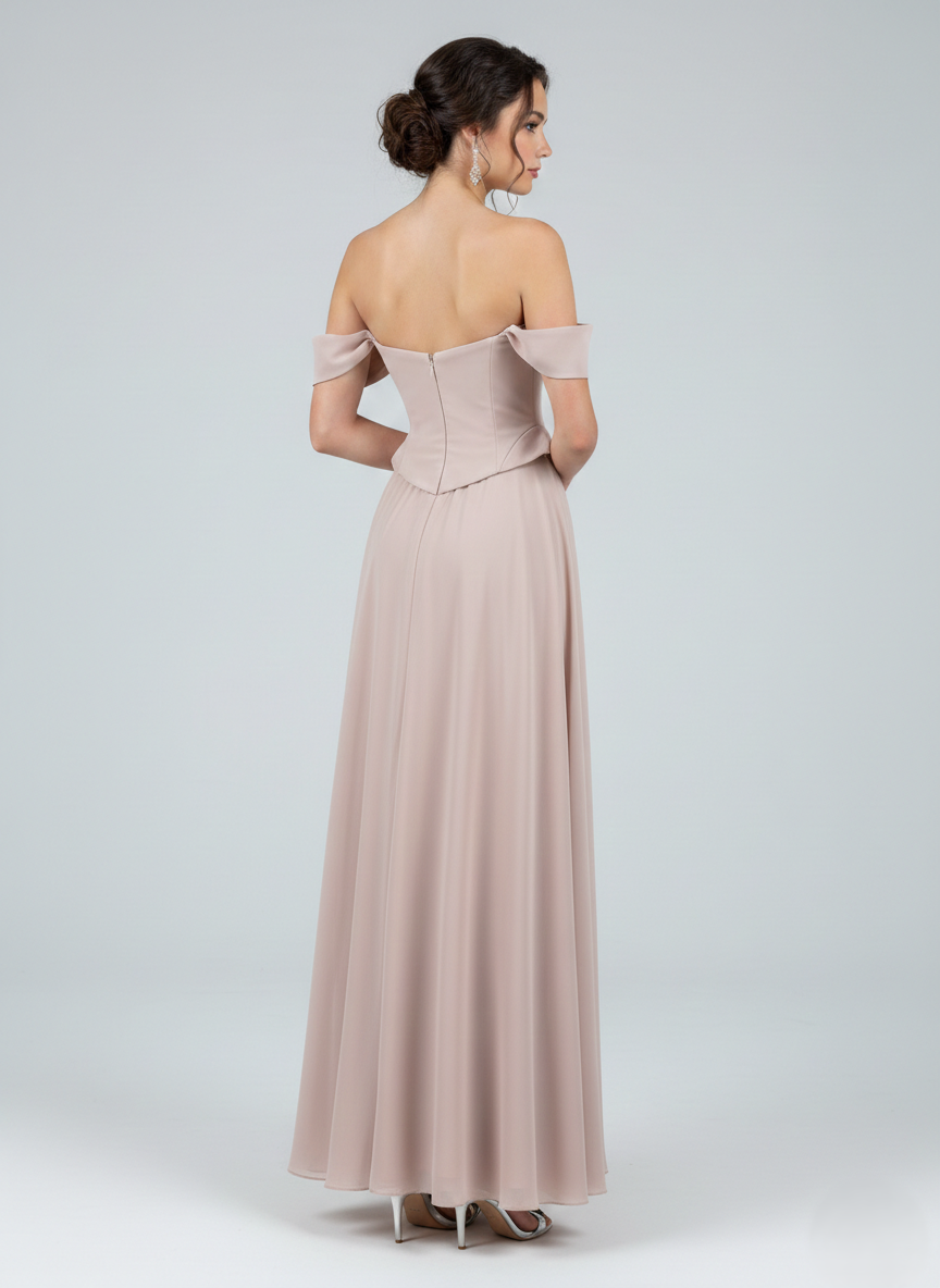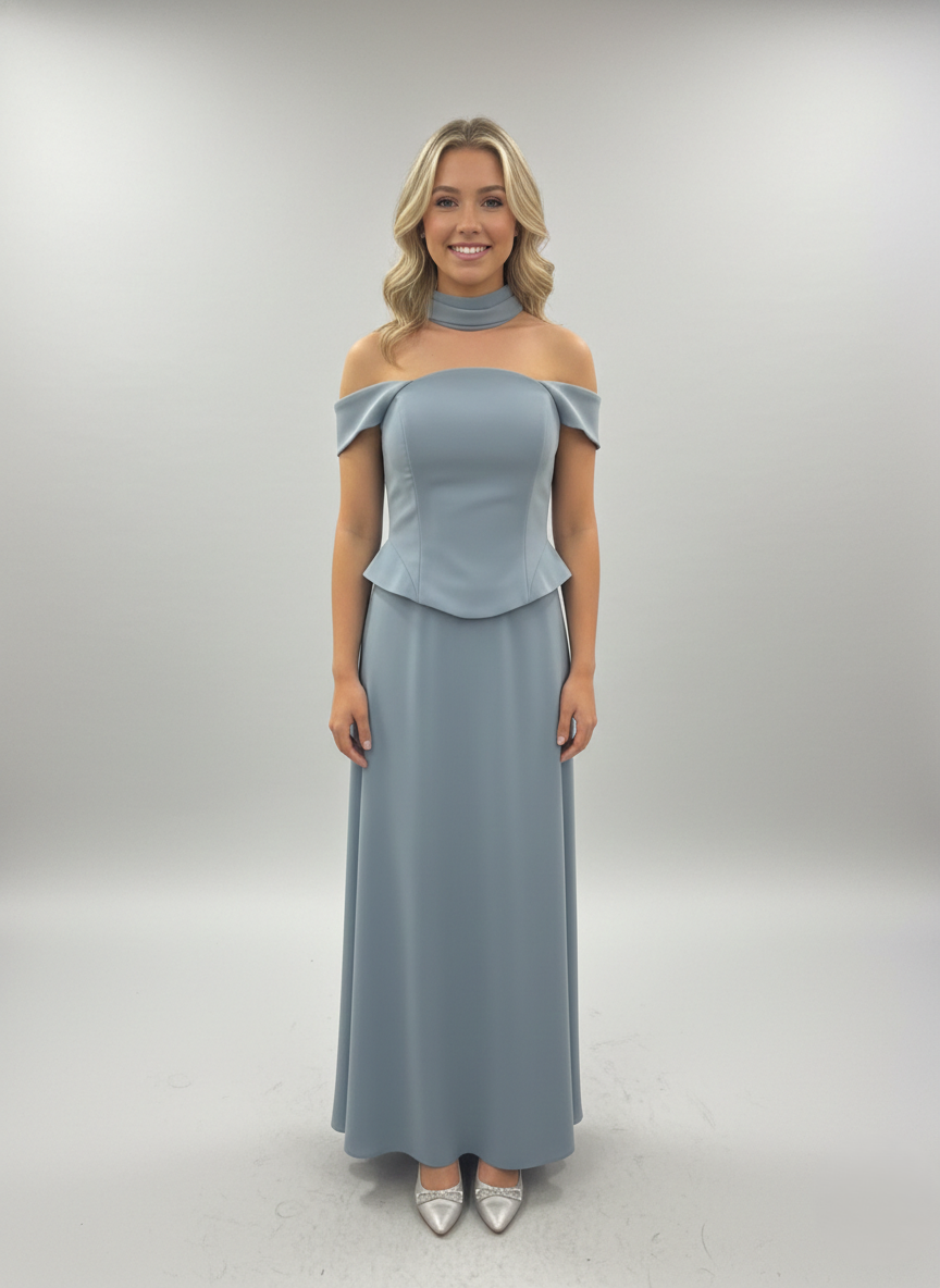 Combining modern design with classic elegance, this gown features a flattering off-shoulder neckline and a tailored bodice. Its flowing skirt creates a graceful silhouette, making it the perfect choice for any special occasion.