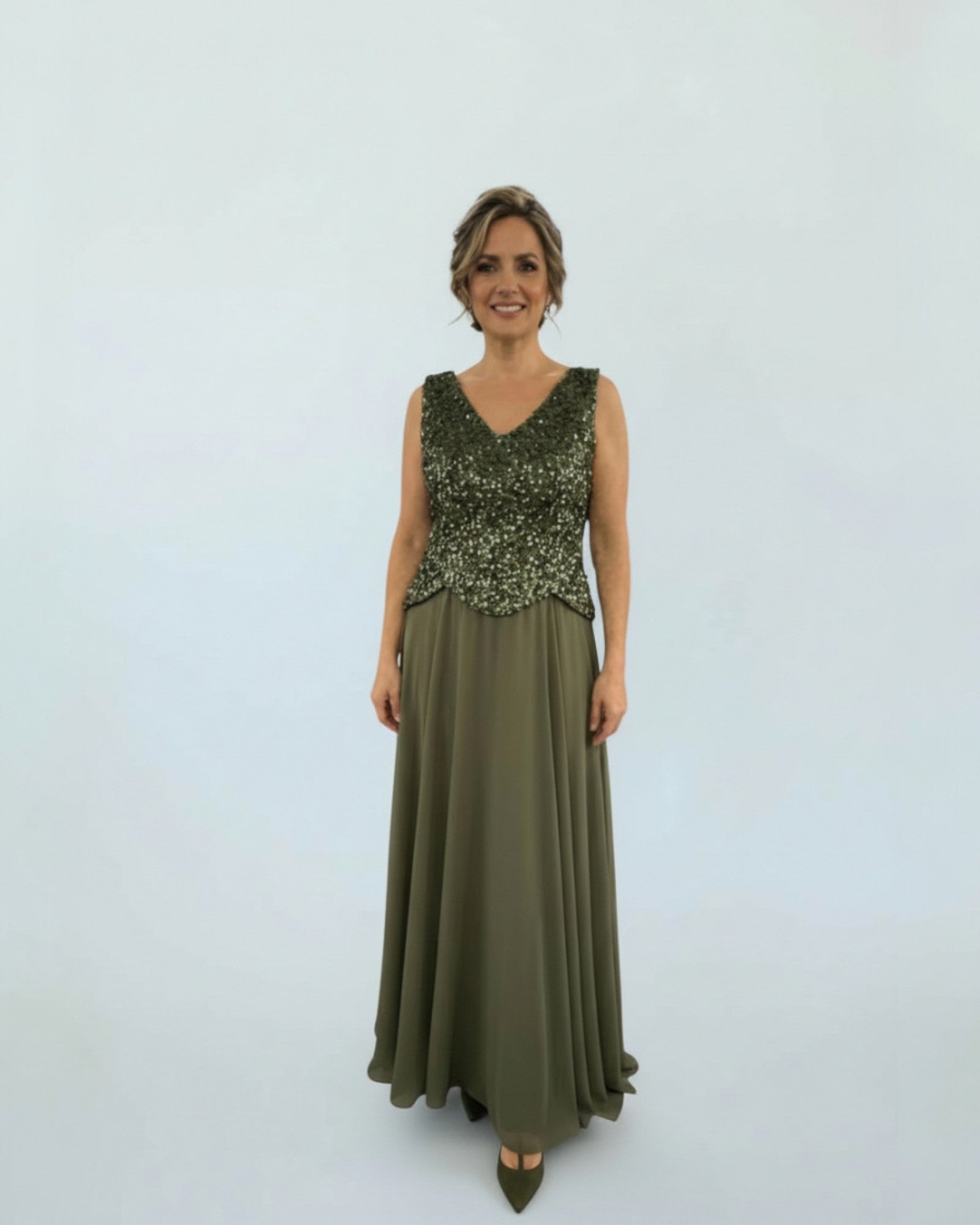 Ein elegantes Abendkleid, das ein funkelndes Pailletten-Oberteil mit einem fließenden, bodenlangen Rock kombiniert. Das ärmellose Design mit V-Ausschnitt sorgt für einen stilvollen und festlichen Auftritt bei jedem besonderen Anlass.
