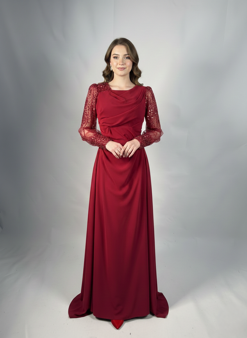 Modern tek omuz kesimi ve zarif drapeli formuyla öne çıkan bu uzun abiye elbise, asil bir şıklık sunar. Simli tül uzun kolları tasarıma ışıltılı ve sofistike bir dokunuş katarken, vücuda oturan silueti zarif bir duruş sağlar. Etek ucundaki hafif kuyruk detayı elbiseye ihtişam kazandırır. Düğünler, nişanlar ve özel davetlerde özellikle anne elbisesi olarak tercih edilebilecek şık ve zamansız bir modeldir.