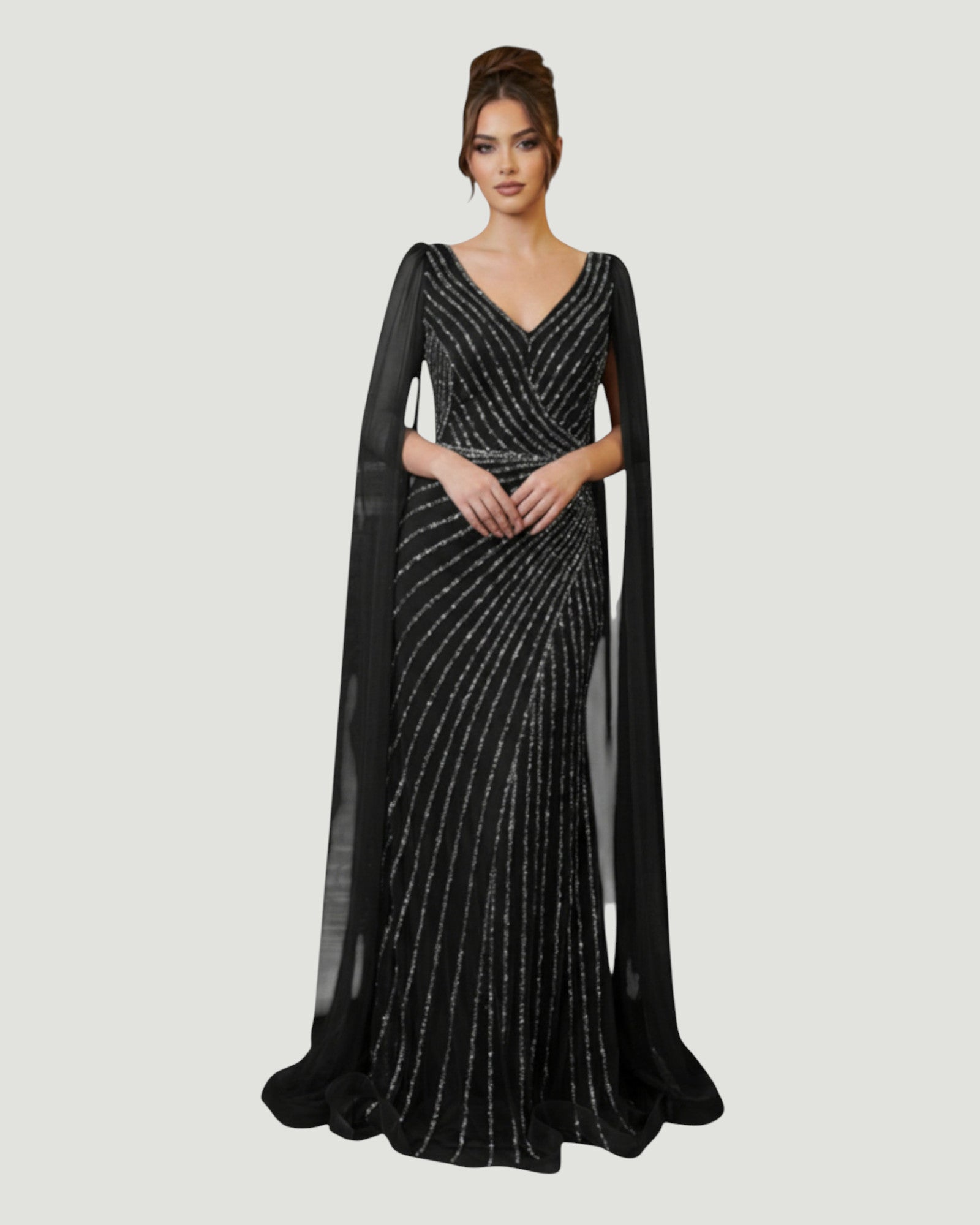 Vücudu saran zarif kesimi ve boydan boya geometrik payet işlemeleriyle göz kamaştırın. Dökümlü tül pelerin kolları ve şık V yaka tasarımı, özel davetlerde modern ve sofistike bir duruş sergilemenizi sağlar.