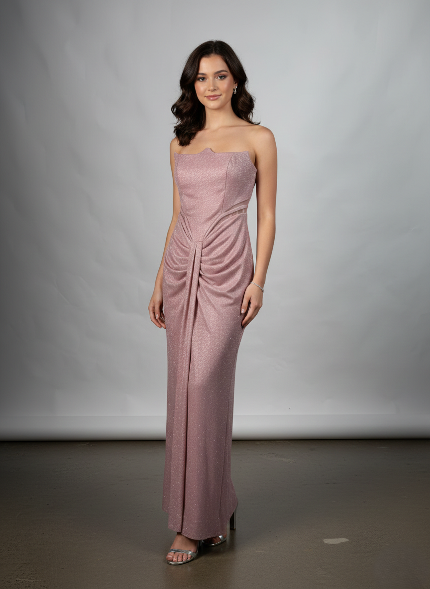A sophisticated strapless design featuring intricate draped detailing at the waist and a shimmering finish. This floor-length gown offers a modern, flattering silhouette perfect for gala events and formal celebrations.