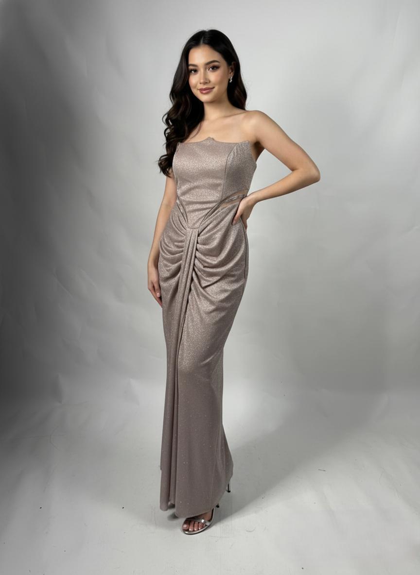 Modern ve sofistike bir dokunuş sunan bu straplez tasarım, gövdedeki drapeli detayları ve ışıltılı kumaşıyla silüetinizi zarifçe vurgular. Özel davetler ve gece etkinlikleri için mükemmel bir seçim.