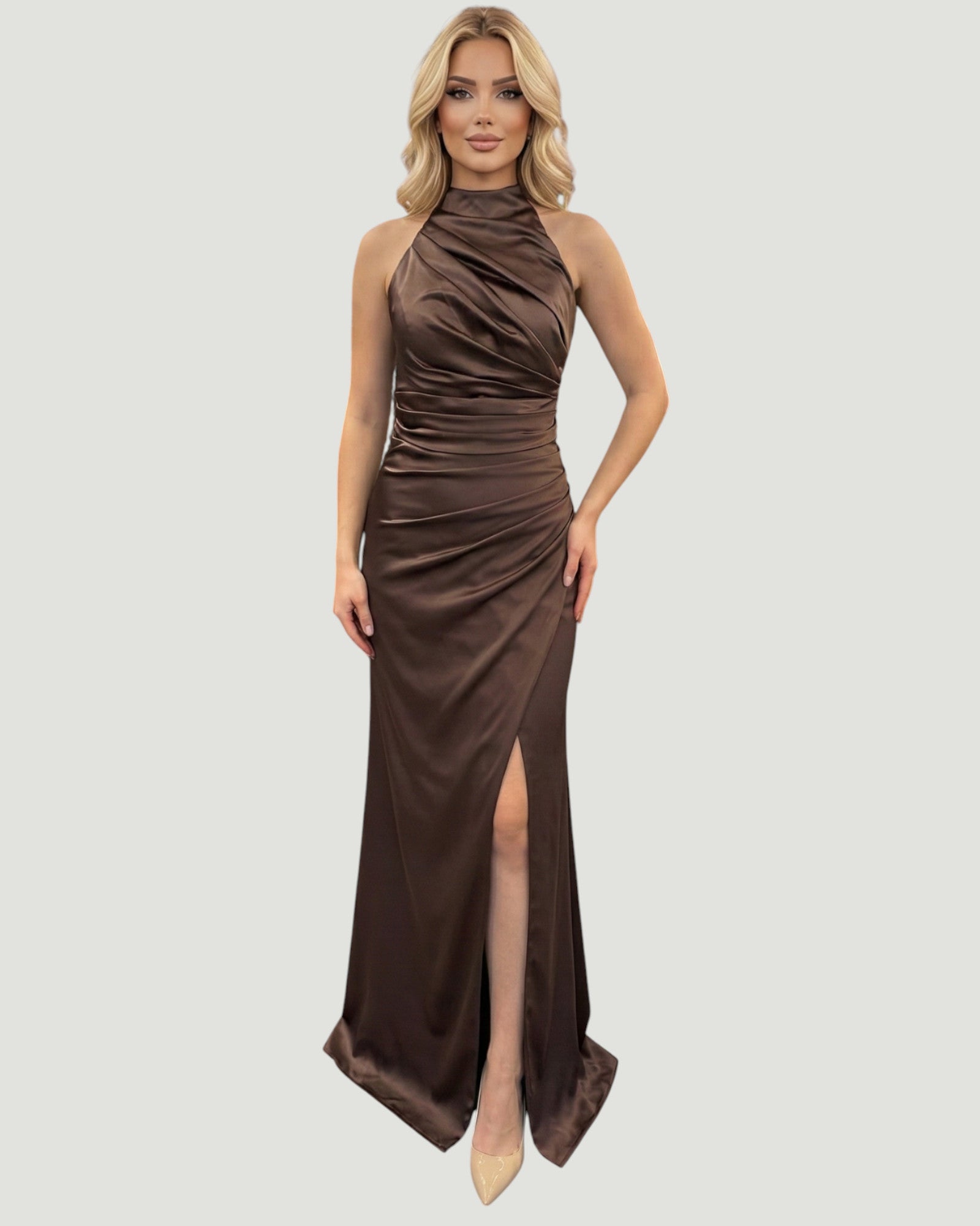Modern halter yaka kesimi ve boydan boya uzanan şık drapeleriyle bu saten elbise, sofistike bir duruş sergiliyor. Parlak dokusu ve iddialı yırtmaç detayıyla modern ve çekici bir görünüm arayanlar için ideal.