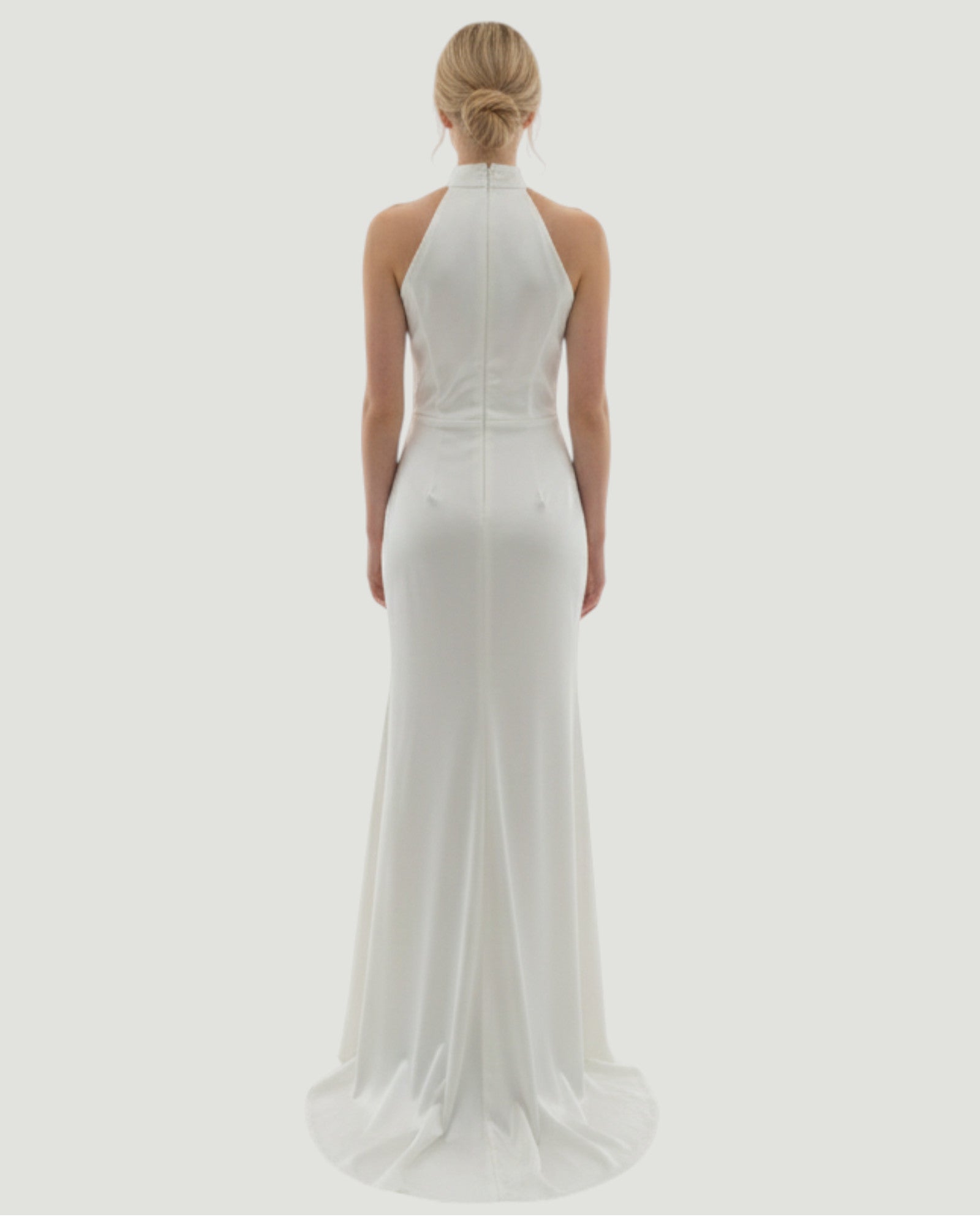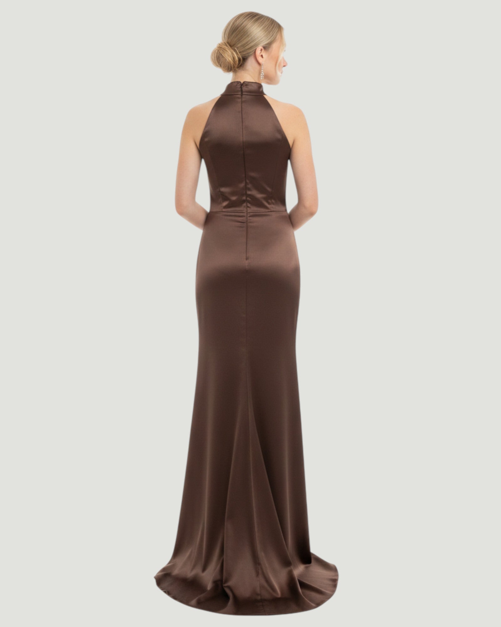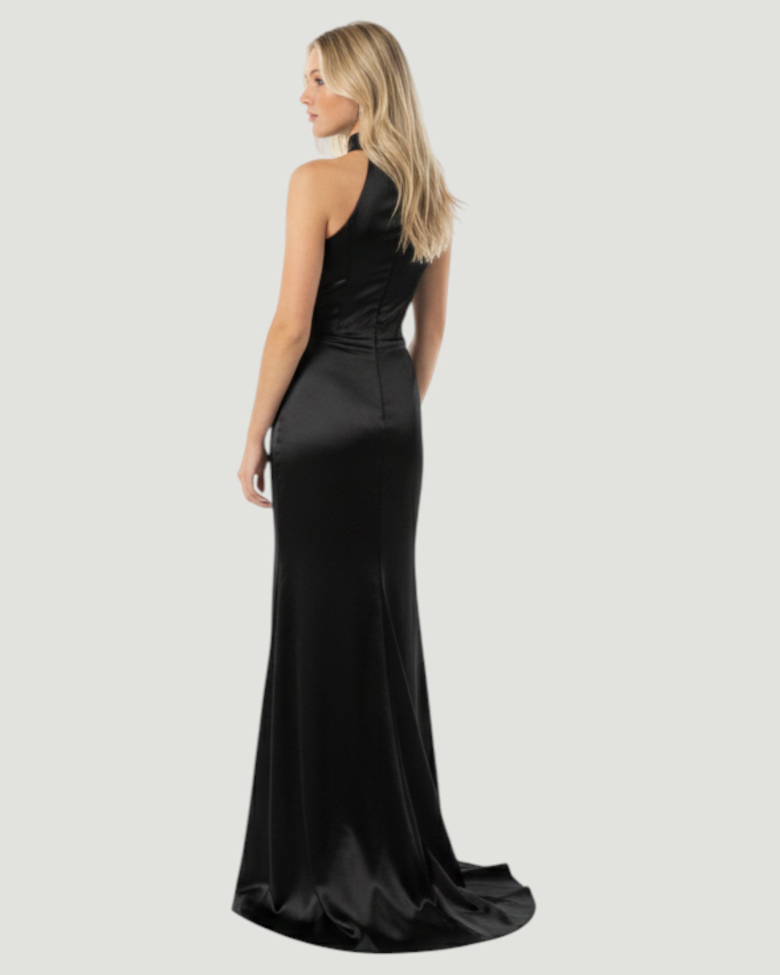 This sleek satin gown features a sophisticated halter neckline and flattering all-over ruching. The lustrous fabric and daring high slit add a touch of modern glamour to this elegant design.