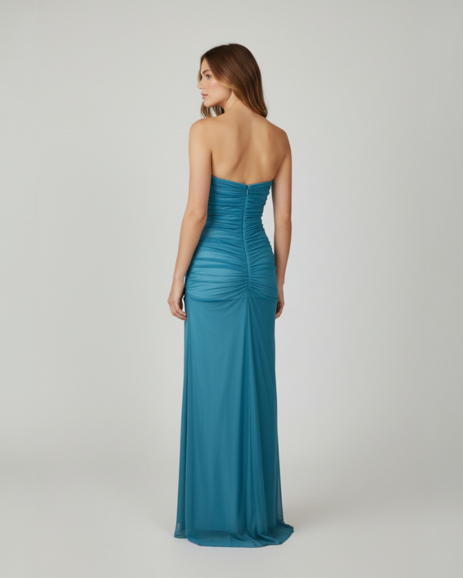 Özel etkinlikler için göz alıcı, uzun straplez abiye. Üst kısım zarif drapelerle şekillendirilmiş, etek ise yan kısımdaki akışkan fırfır detayıyla hareketlendirilmiştir. Zarif ve feminen bir silüet sunar.