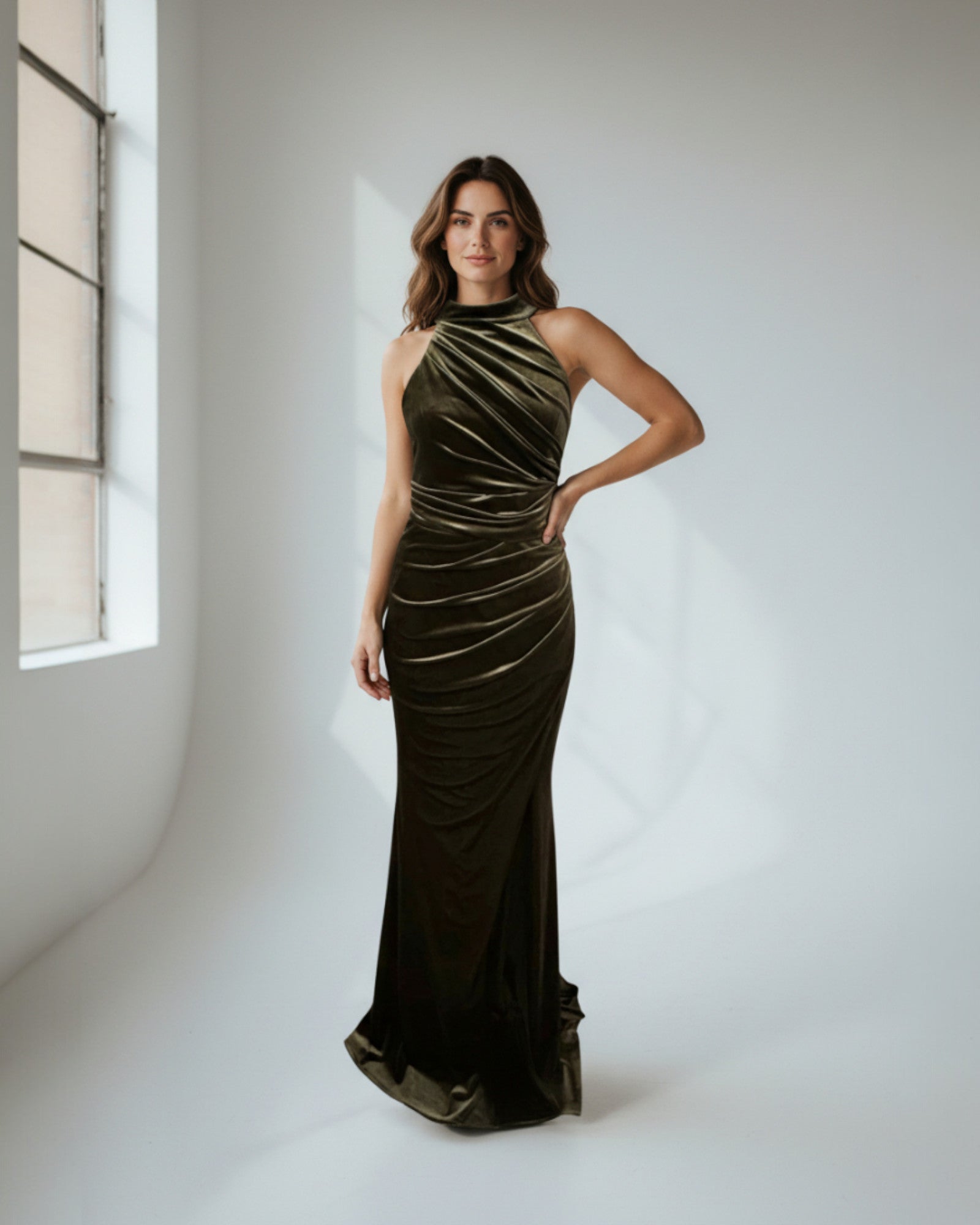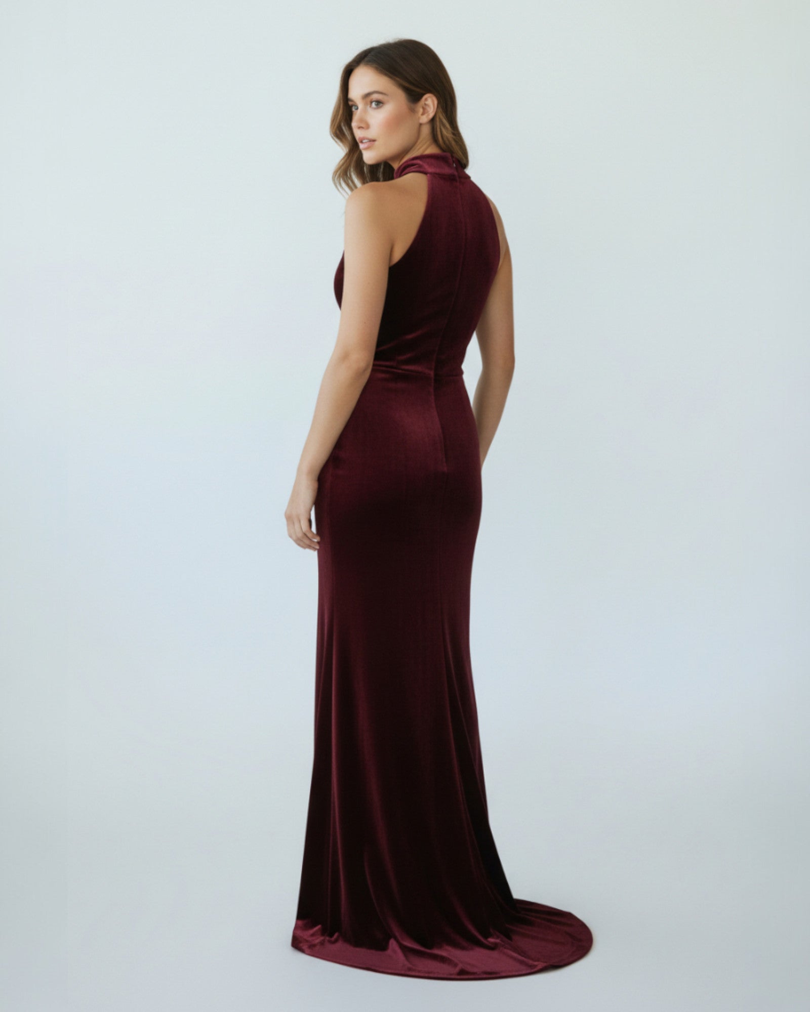 An elegant, form-fitting evening gown made from velvet fabric. It features a high halter neckline and striking cross-body draping across the bodice and skirt. Creates a breathtaking silhouette.