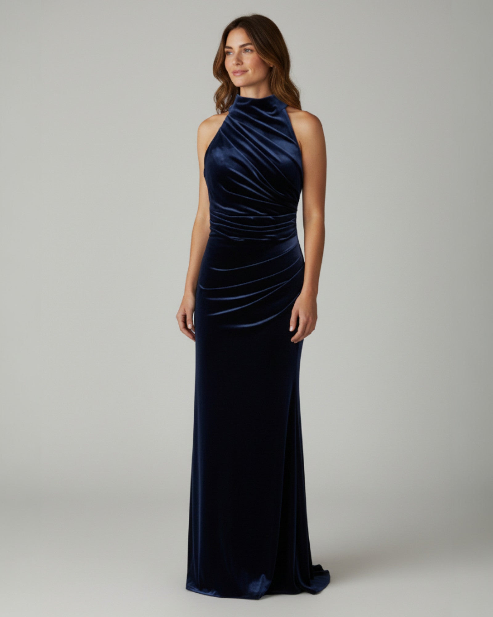 Ein elegantes, figurbetontes Abendkleid aus samtigem Stoff. Es verfügt über einen hohen Neckholder-Ausschnitt und eine auffällige, quer verlaufende Drapierung am Oberkörper und Rock. Diese raffinierte Wickeloptik sorgt für eine atemberaubende Silhouette.