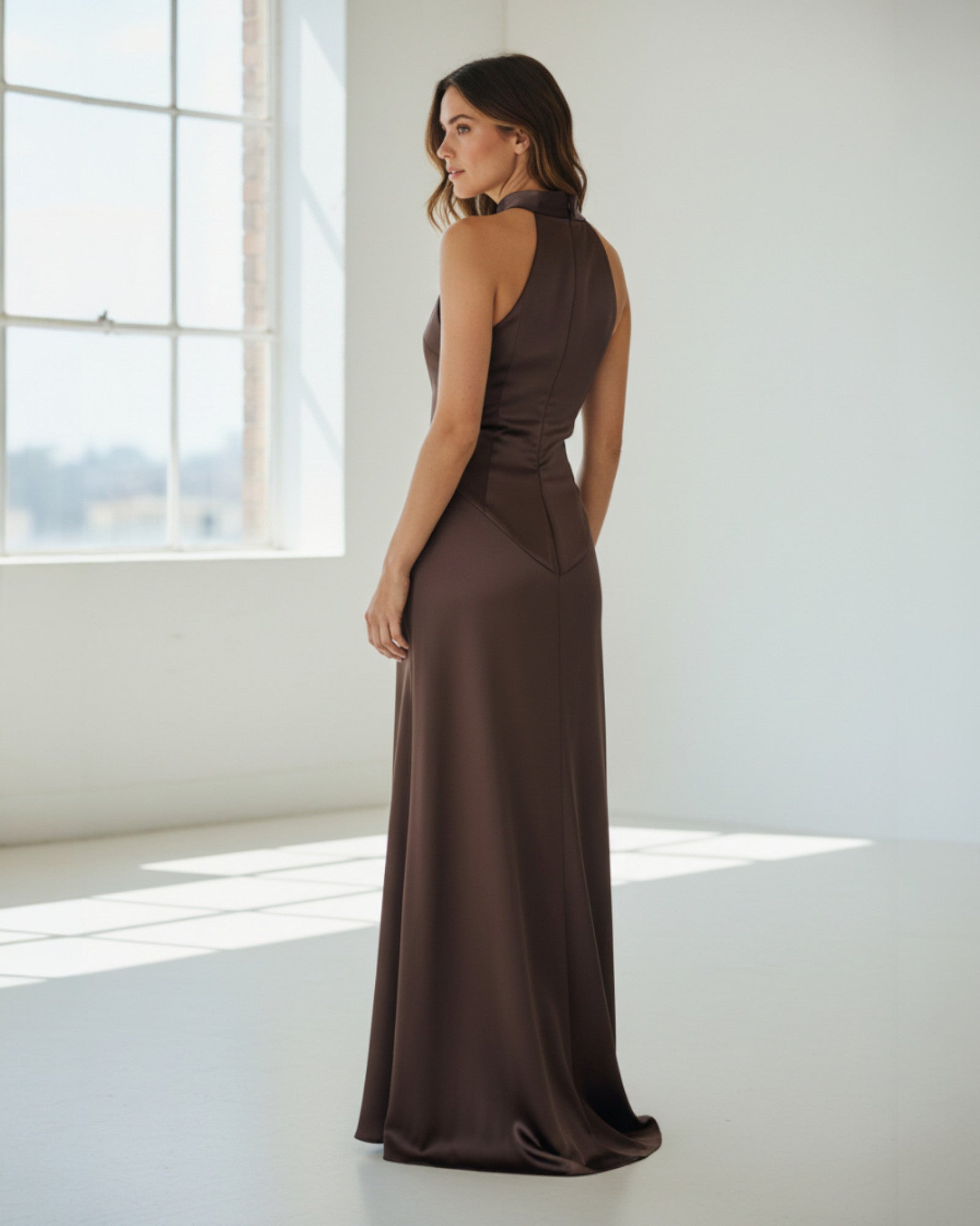A timeless, floor-length gown made from lustrous satin-look fabric. The design features a corset-style bodice and a clean, high halter neckline. The flowing skirt with subtle waist ruching creates a flawless, modern silhouette.
