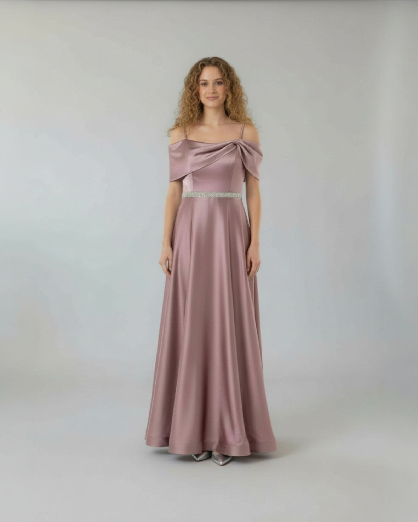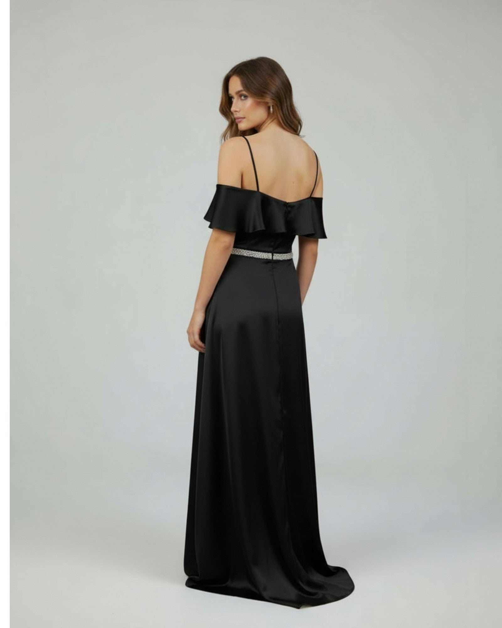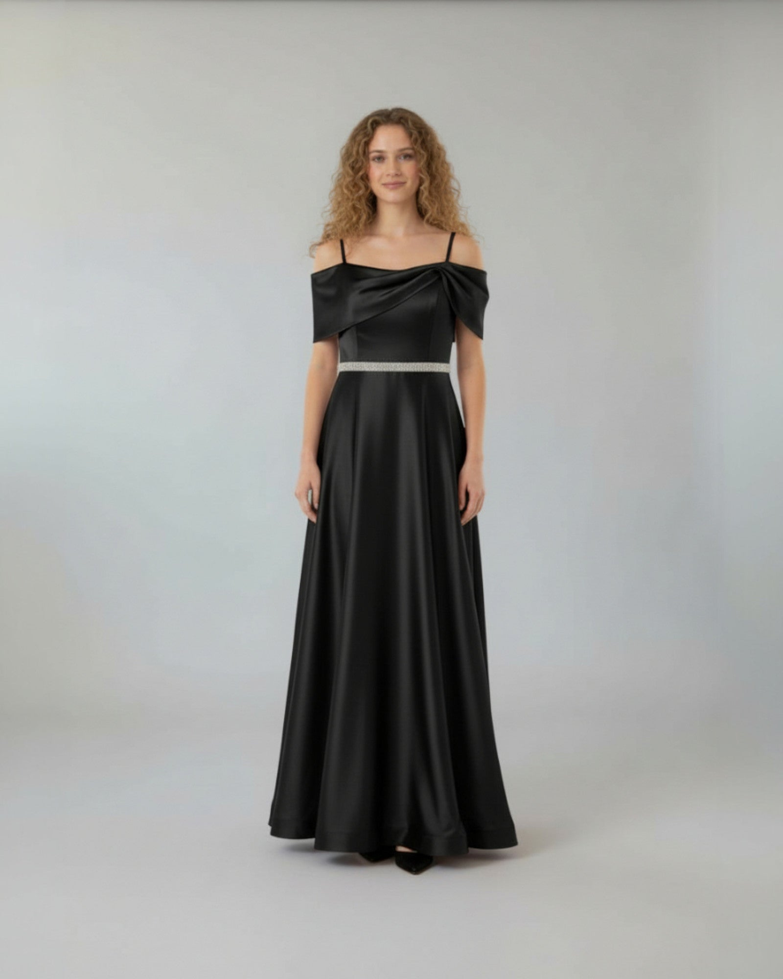 Zarif A-kesim silueti ve şık düşük omuz tasarımıyla öne çıkan bu uzun saten elbise, belindeki ışıltılı kristal kemer detayıyla özel davetlerinizde göz alıcı ve asil bir görünüm sunar.