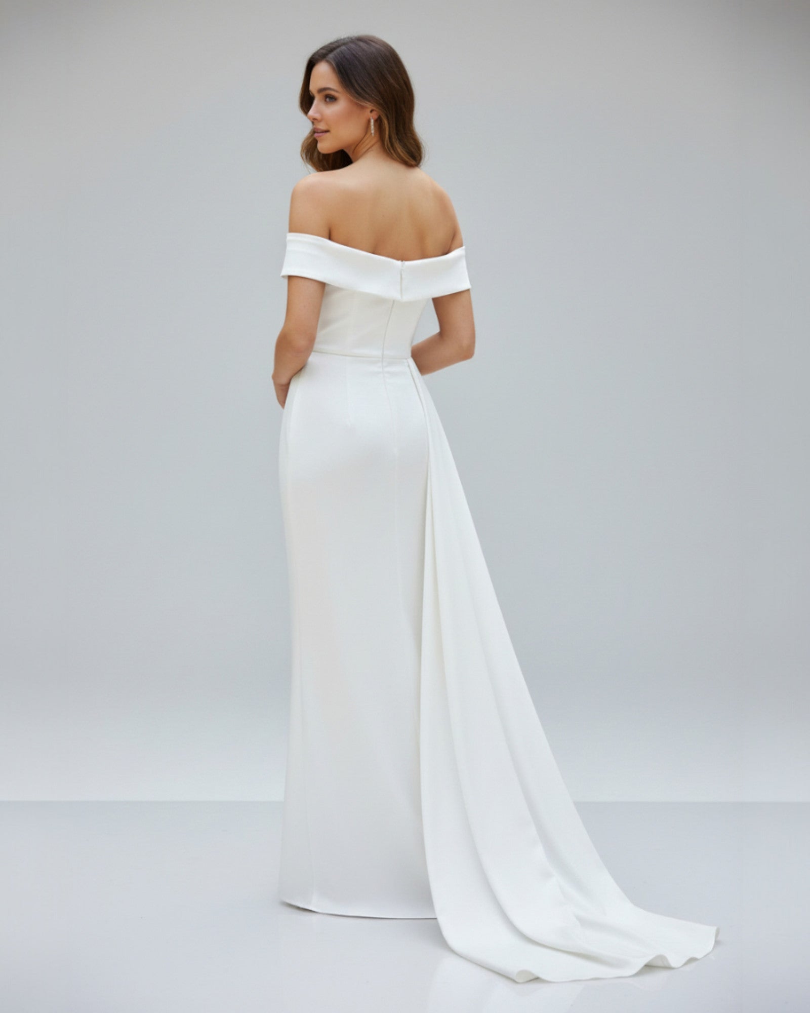 Crafted from lustrous satin, this floor-length gown features a classic off-the-shoulder neckline that exudes timeless elegance. The flattering ruched waist creates a beautiful silhouette, complemented by a dramatic side drape that adds movement and glamour. An ideal choice for formal events and black-tie occasions.