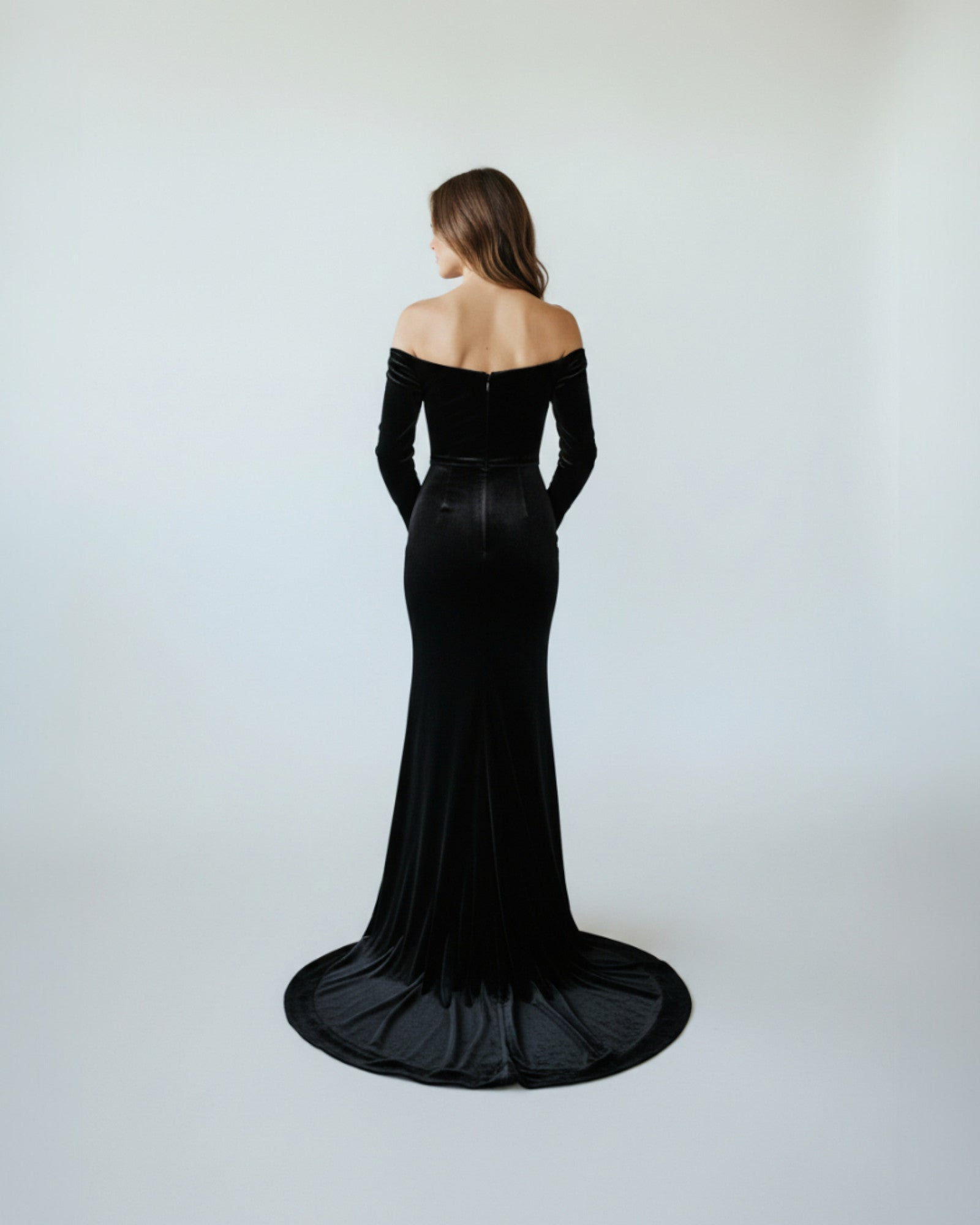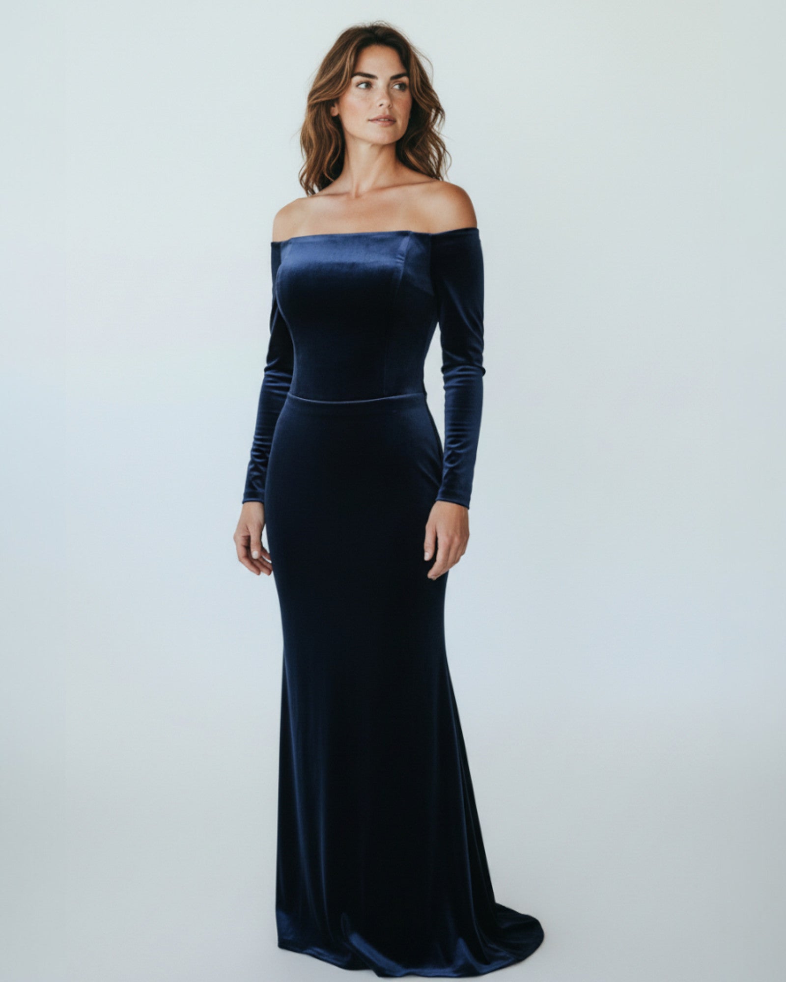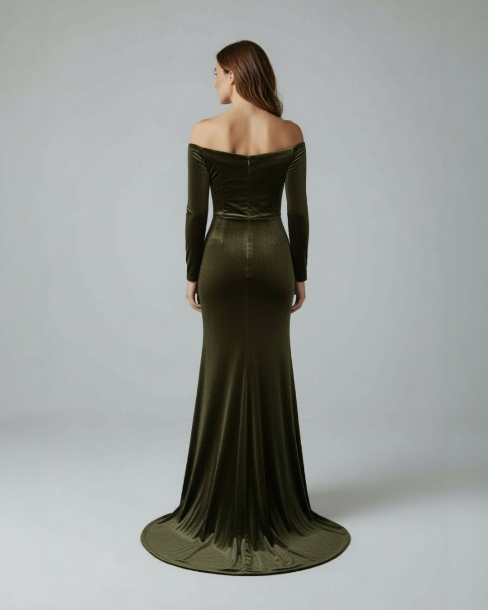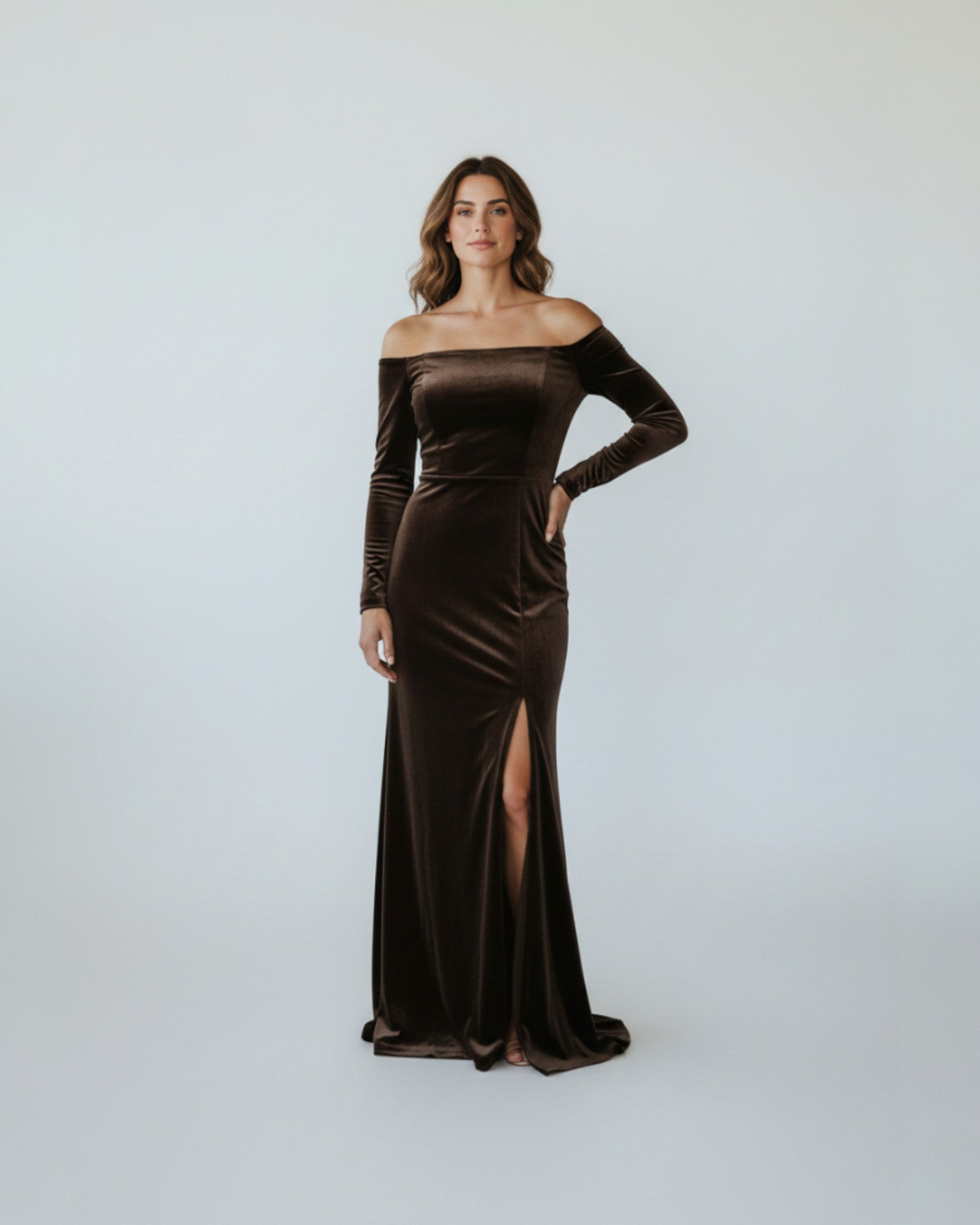 An elegant, floor-length gown crafted from soft velvet fabric. The design features a sophisticated off-shoulder (Bardot) neckline and long sleeves. This fitted silhouette is finished with a subtle side slit.