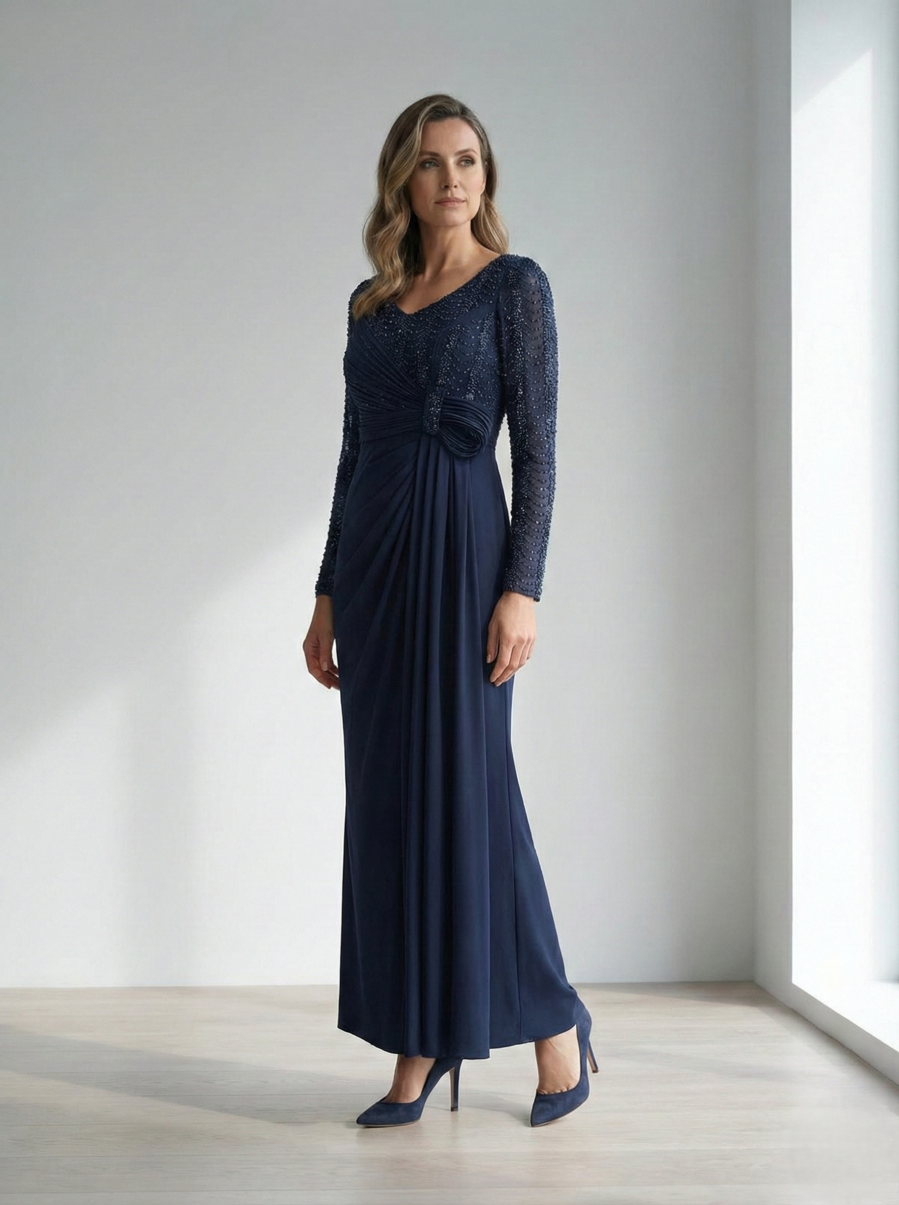 Beaded Long-Sleeve Chiffon Evening Dress