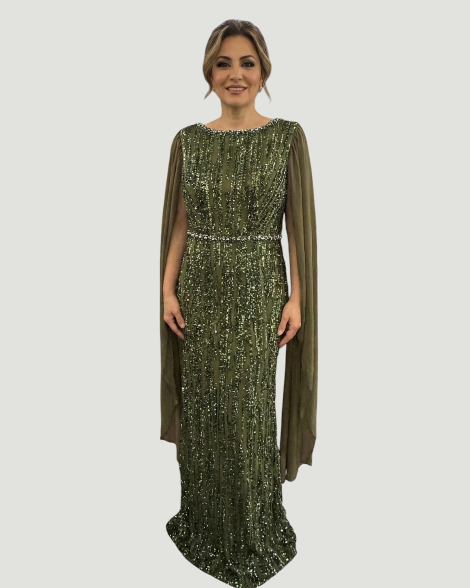 "Radiate elegance in this floor-length evening gown, fully embellished with shimmering sequins. Featuring a beaded waistline to define the figure and sophisticated sheer cape sleeves that add graceful movement, this dress offers a timeless, glamorous look ideal for formal events and special occasions."