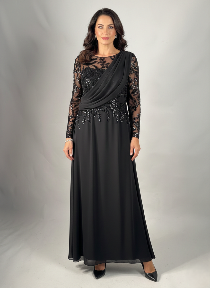 This elegant black evening dress features a refined draped bodice and delicate bead embellishments. The sheer lace long sleeves and flowing skirt create a graceful and timeless silhouette. Perfect for weddings, formal evenings, and mother-of-the-bride occasions.