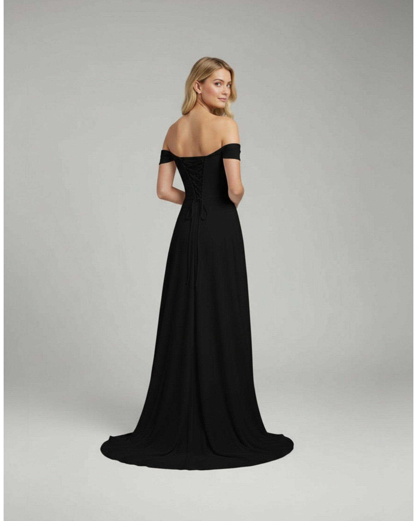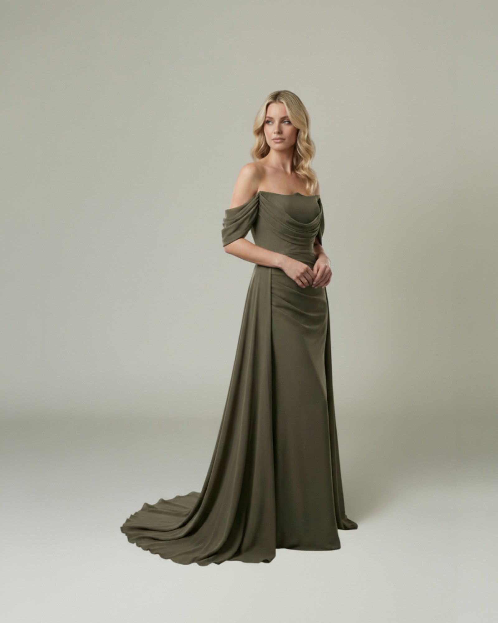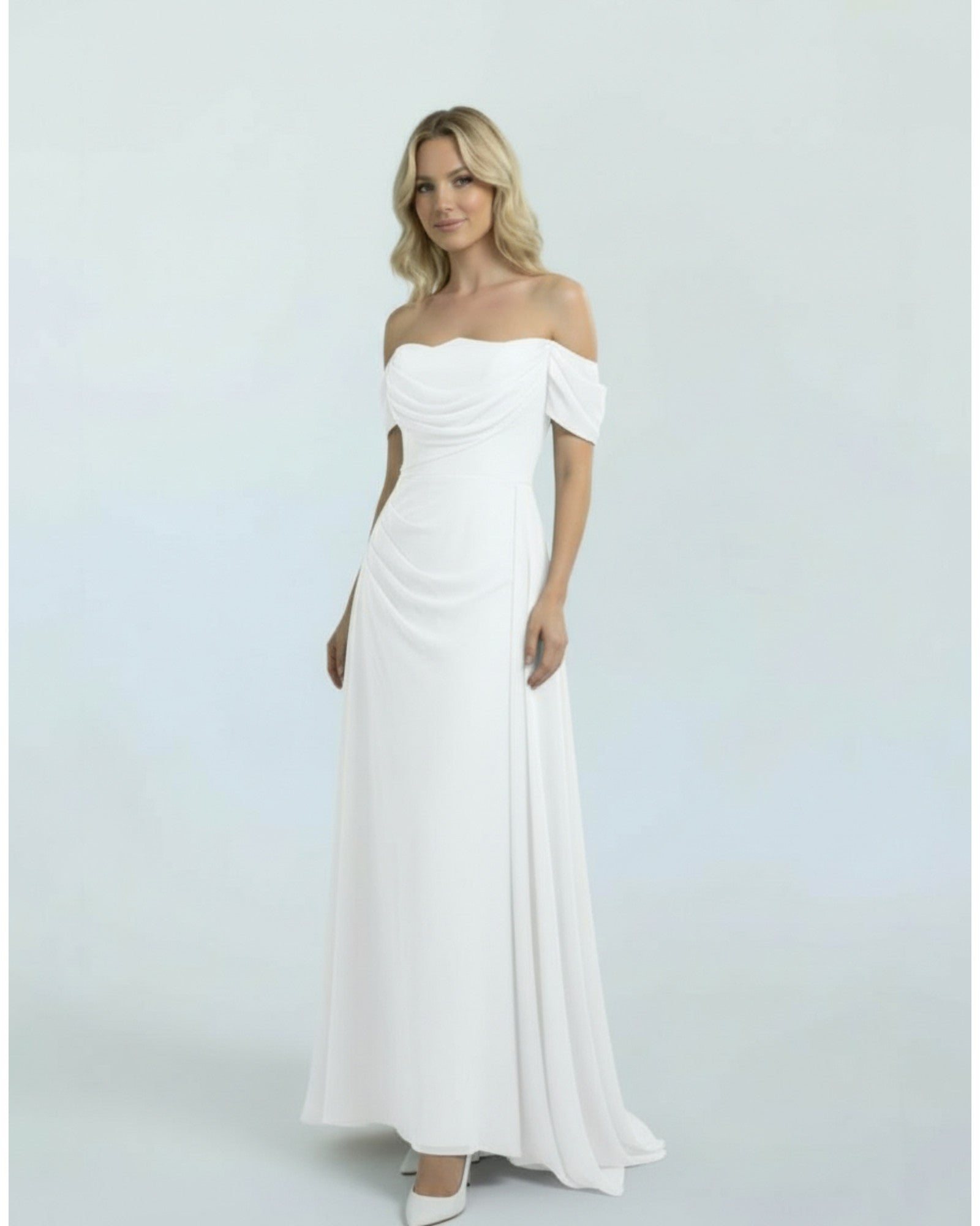 Draped Off-the-Shoulder Chiffon Gown Featuring an elegant off-the-shoulder neckline with a beautifully draped bodice, this gown exudes sophistication. The flowing fabric extensions and ruched waist detail create a graceful and flattering silhouette, perfect for any formal event.