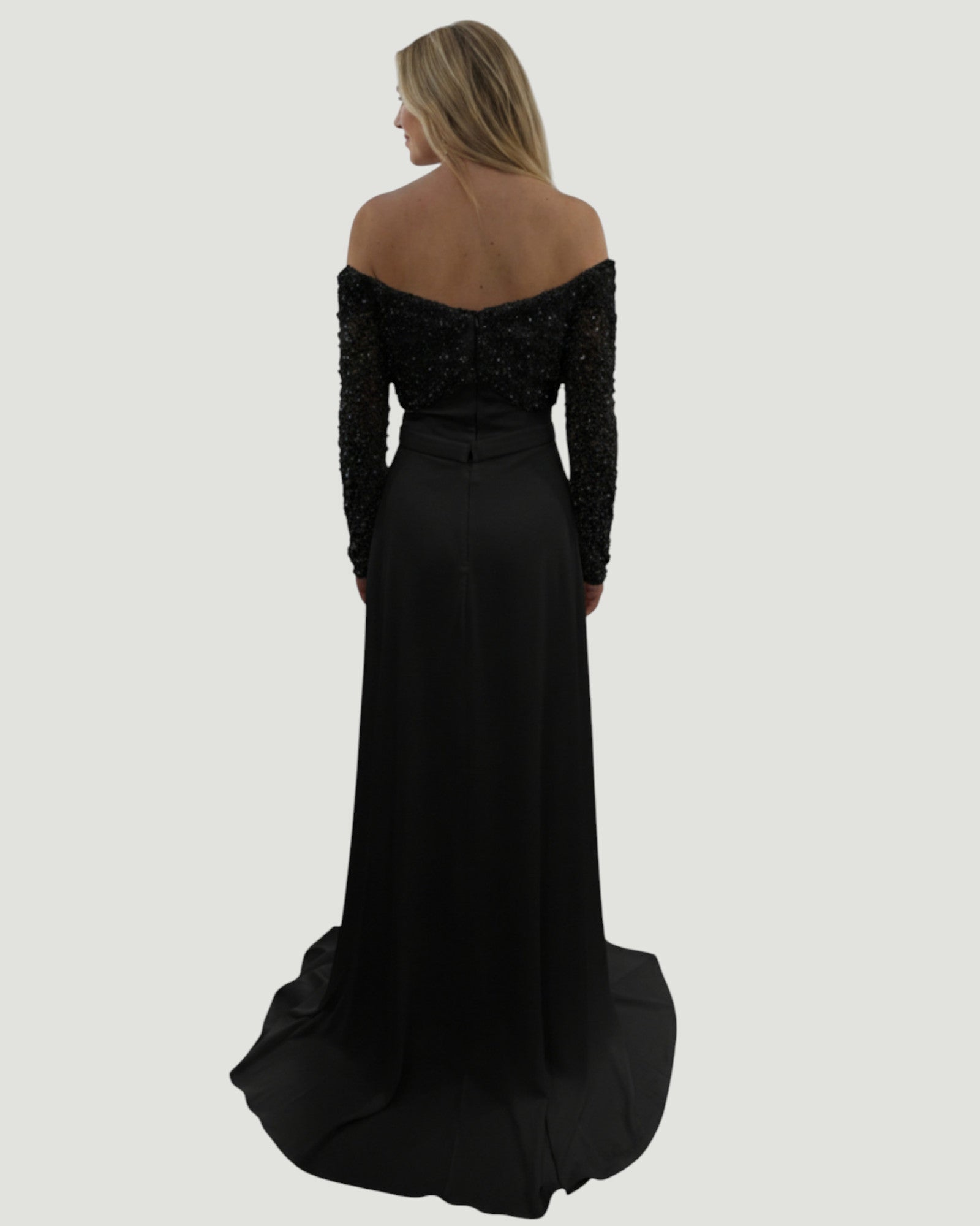 Radiating luxury, this gown features a stunning off-the-shoulder neckline heavily adorned with intricate pearl and bead embellishments. The flattering ruched waist and smooth, flowing fabric create a sophisticated silhouette, while the sparkling long sleeves add a touch of glamour. A majestic choice for your most memorable events.