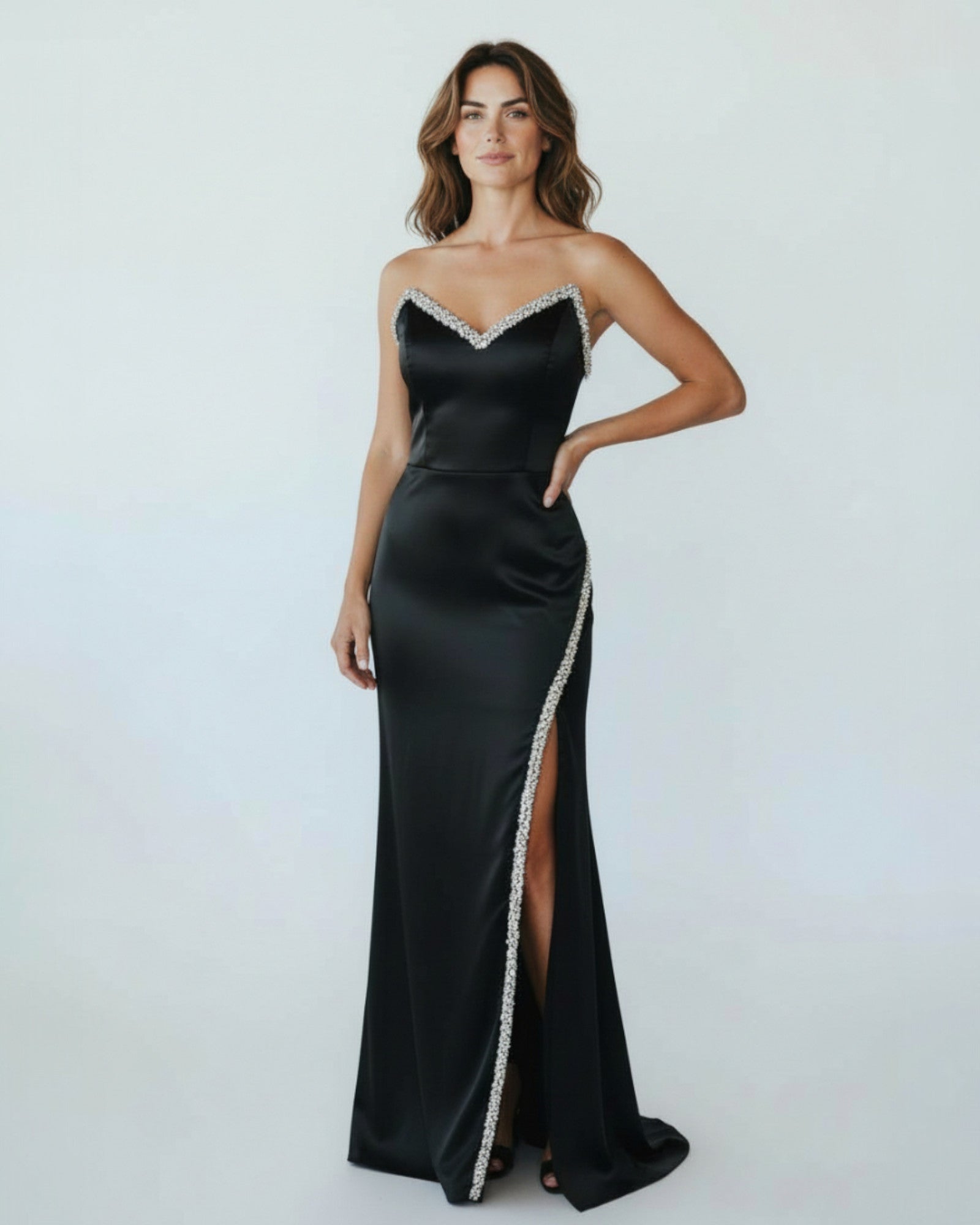 Ein atemberaubendes, langes Abendkleid aus glänzendem Satinstoff. Das Modell hat einen herzförmigen (trägerlosen) Ausschnitt und einen tiefen Seitenschlitz, die jeweils mit elegantem Stein- oder Perlenbesatz verziert sind. Perfekt für einen selbstbewussten und stilvollen Auftritt bei festlichen Anlässen.