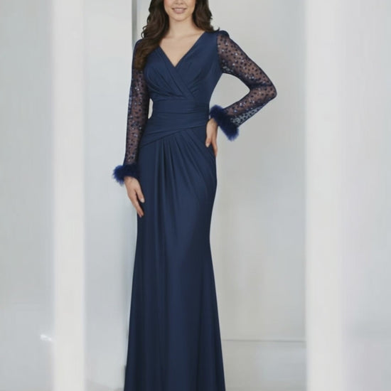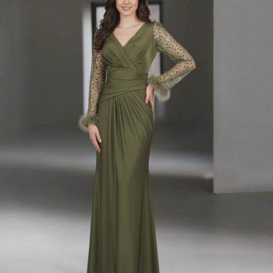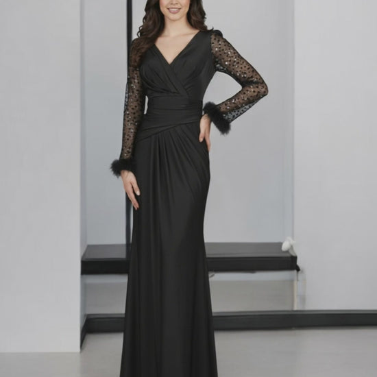 A sophisticated floor-length gown featuring a flattering V-neckline and a gathered waist that accentuates the silhouette. The sheer, sequin-embellished sleeves are finished with elegant feather cuffs, adding a touch of glamour and luxury to this timeless design.