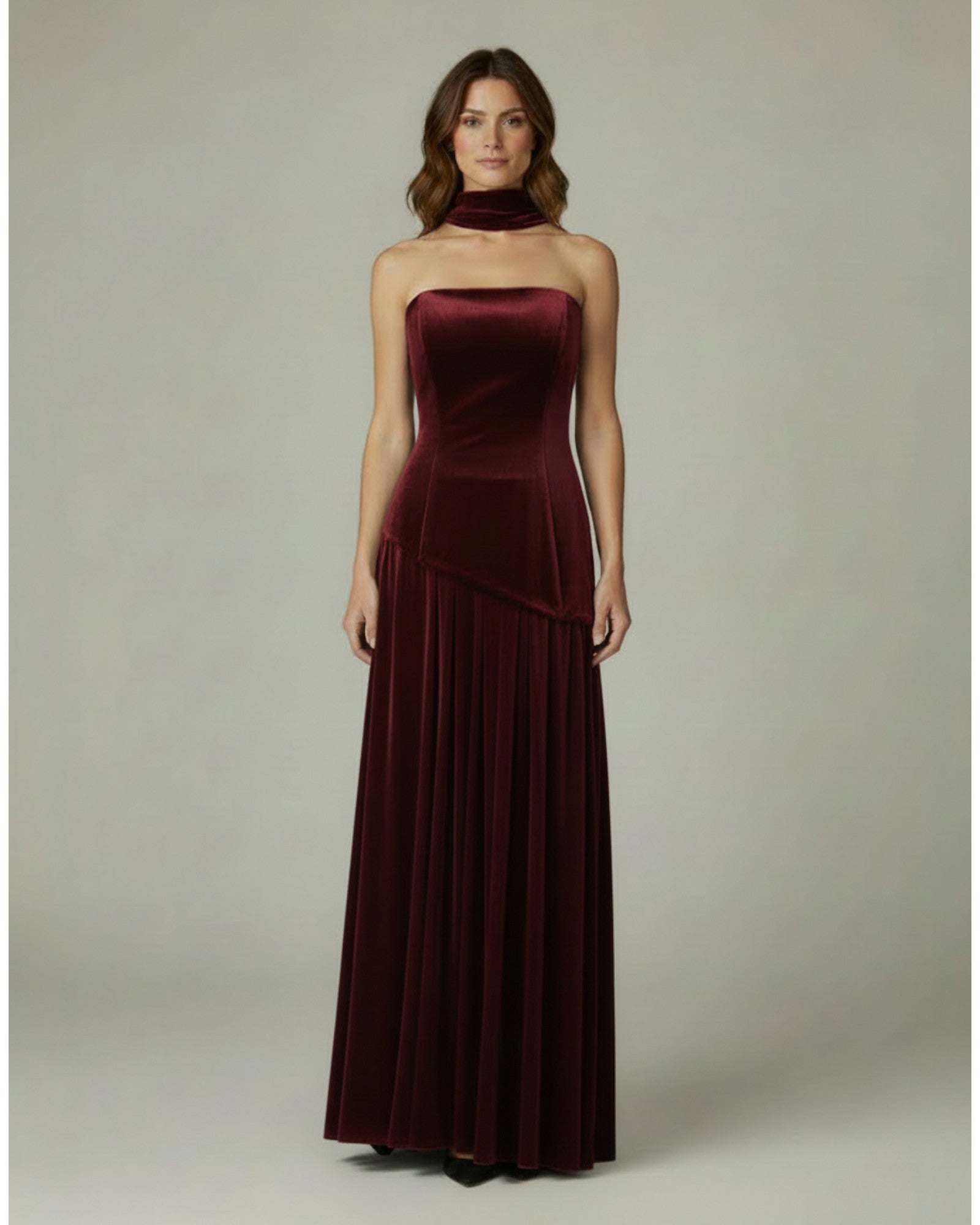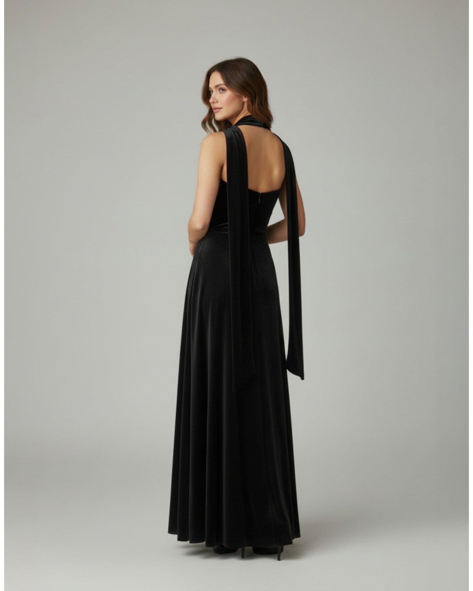 This long evening dress features a soft velvet texture and a modern halter neckline, offering an elegant and sophisticated look. The fitted bodice enhances a feminine silhouette, while the pleated skirt adds graceful movement. Its timeless design makes it perfect for weddings, formal events, and special occasions.