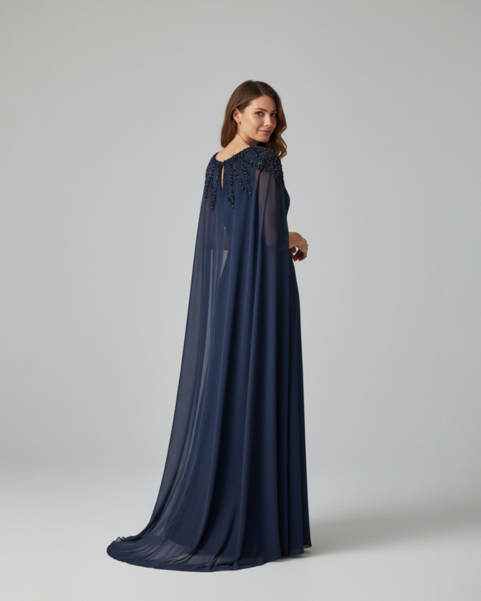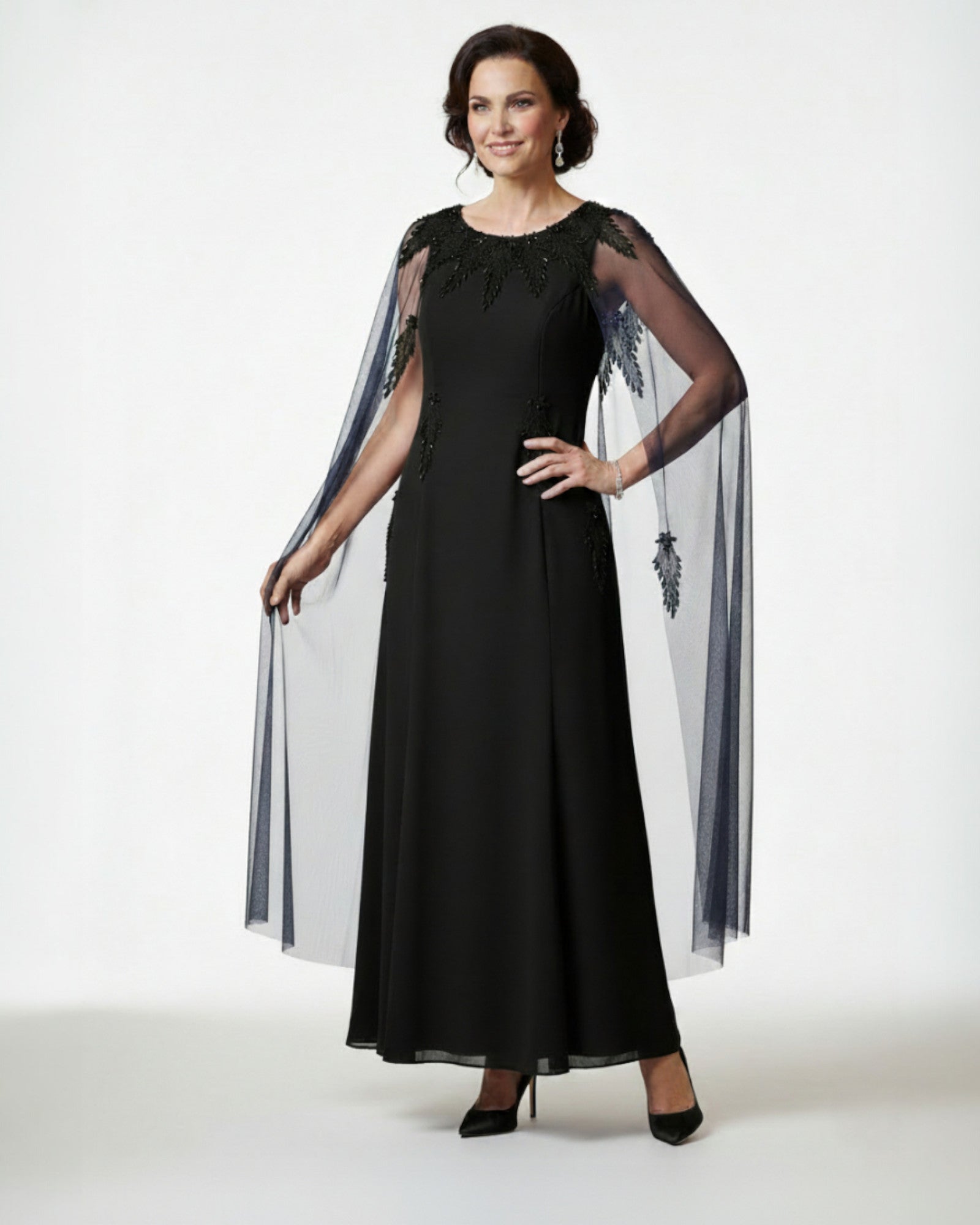 This elegant long evening dress features delicate embroidery and a sheer tulle cape detail for a timeless and sophisticated look. The comfortable silhouette offers ease of movement, making it perfect for formal events and special occasions.