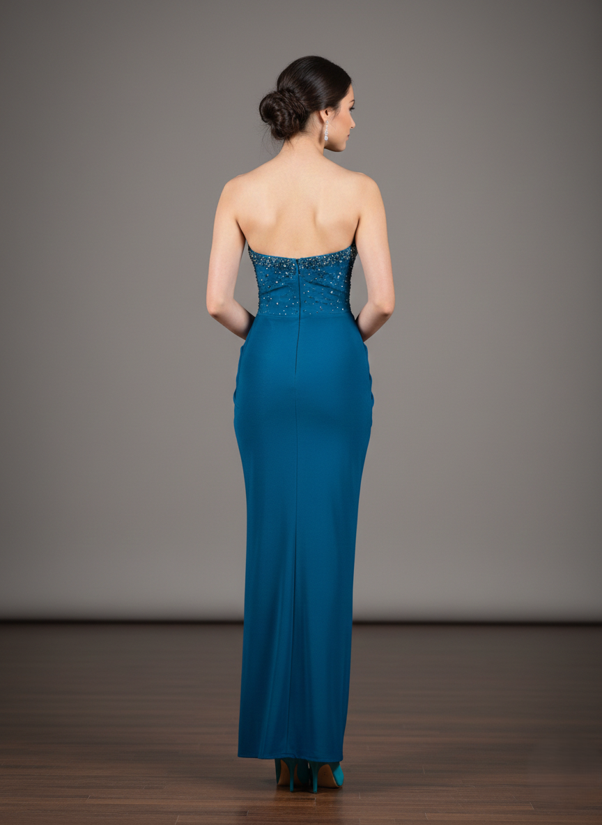 This long evening dress features a strapless neckline and elegant embellishment details on the bodice, creating a refined and feminine silhouette. The draped waist accentuates the figure, while the slit adds a modern and striking touch. A perfect choice for formal occasions and special events.