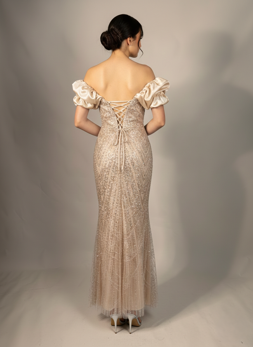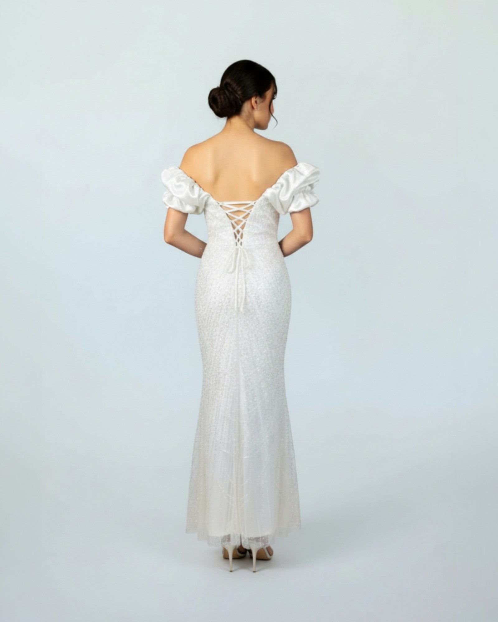 Hafif şifon kumaşı ve akıcı kesimiyle özel davetler için ideal bir elbise. Vücudu nazikçe saran yapısıyla feminen ve sofistike bir duruş sunar.