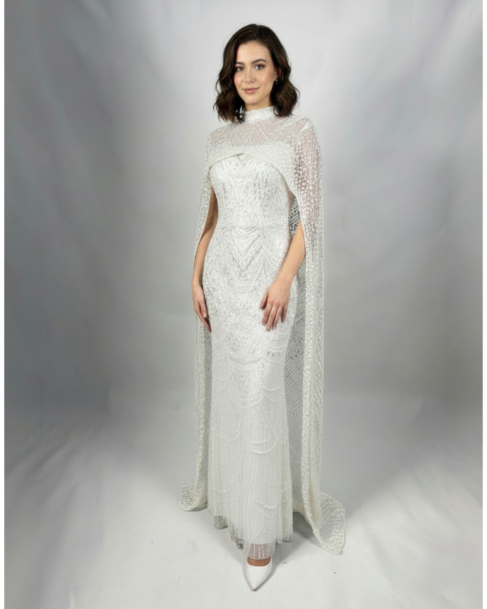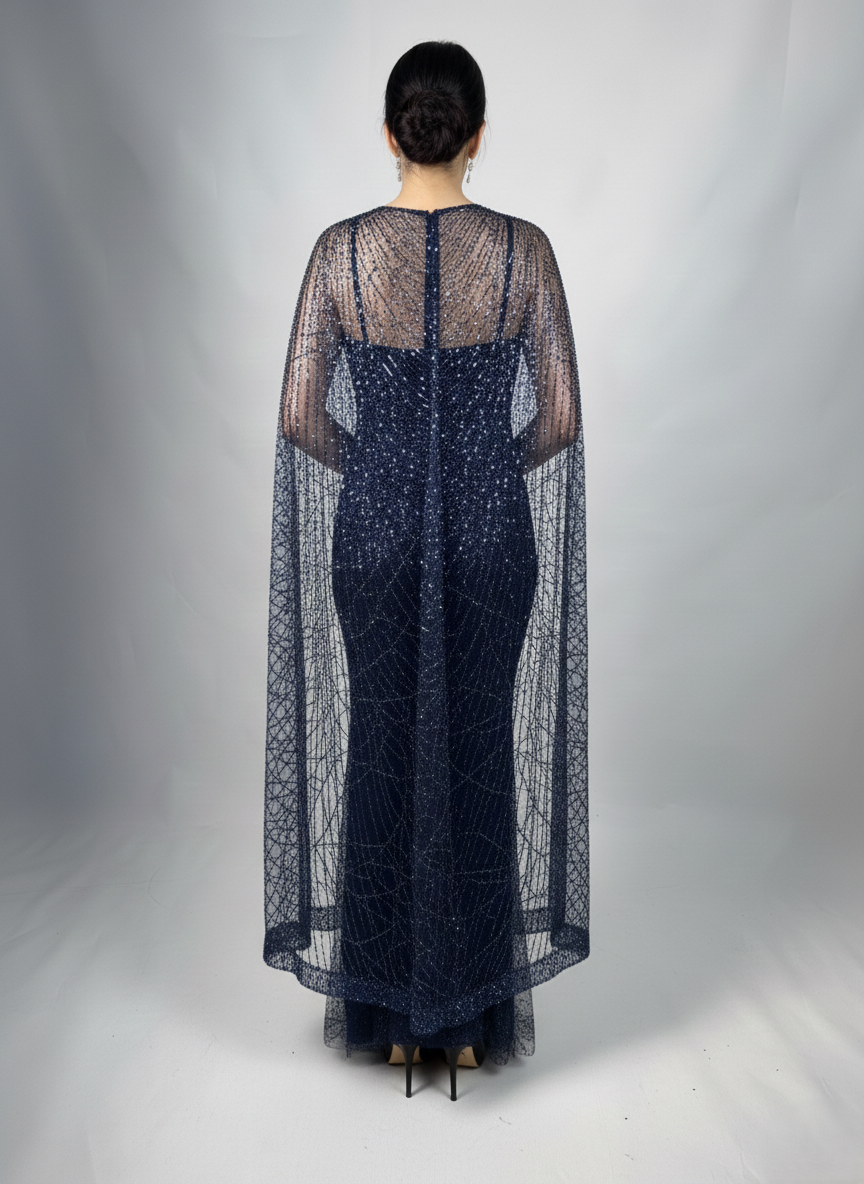 Embellished Long Evening Dress with Cape Detail
