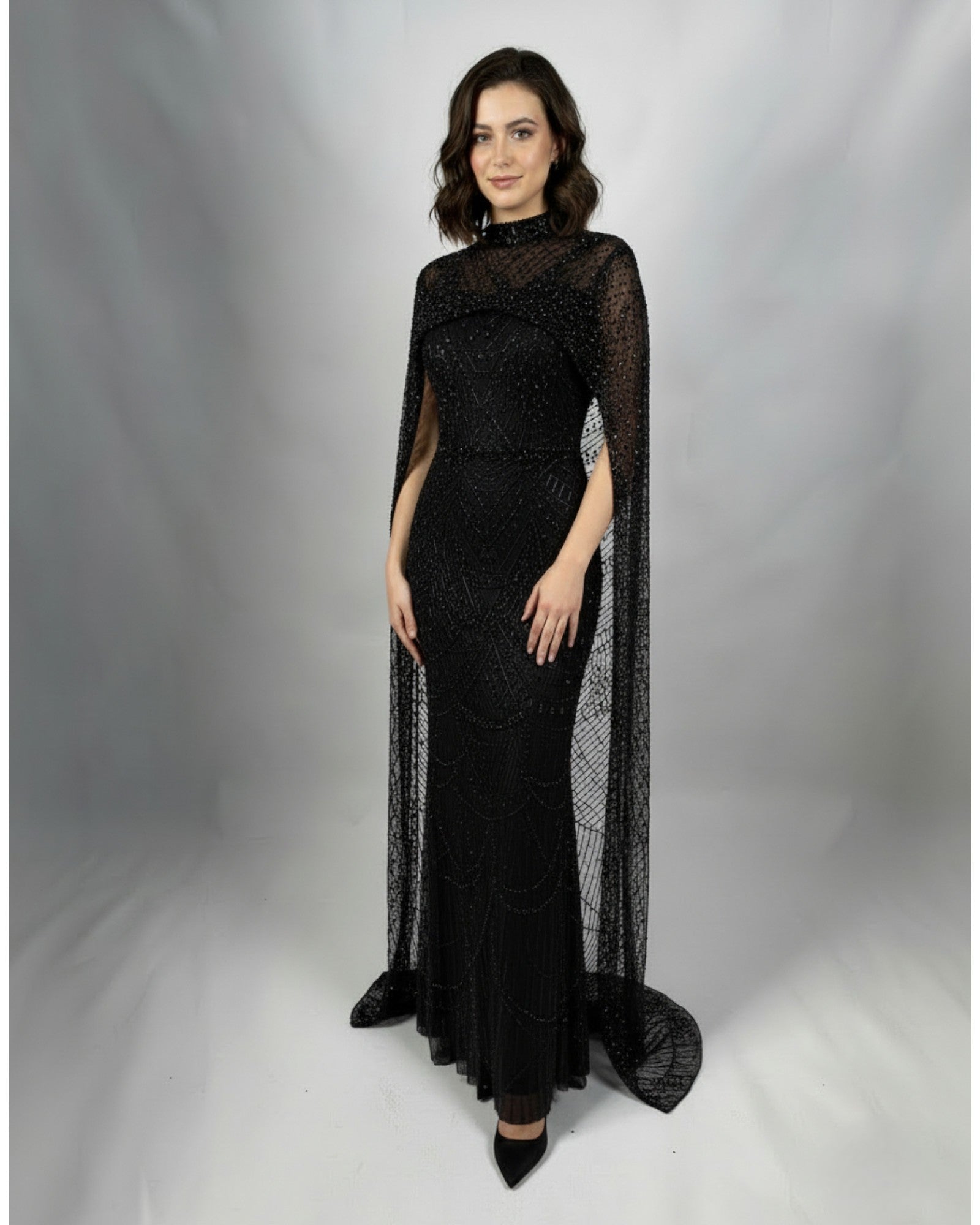 This elegant long evening dress features intricate embellishments and a sheer cape detail for a refined and dramatic look. The fitted silhouette enhances the figure, while the high neckline adds a touch of sophistication. Perfect for galas and formal evening events.